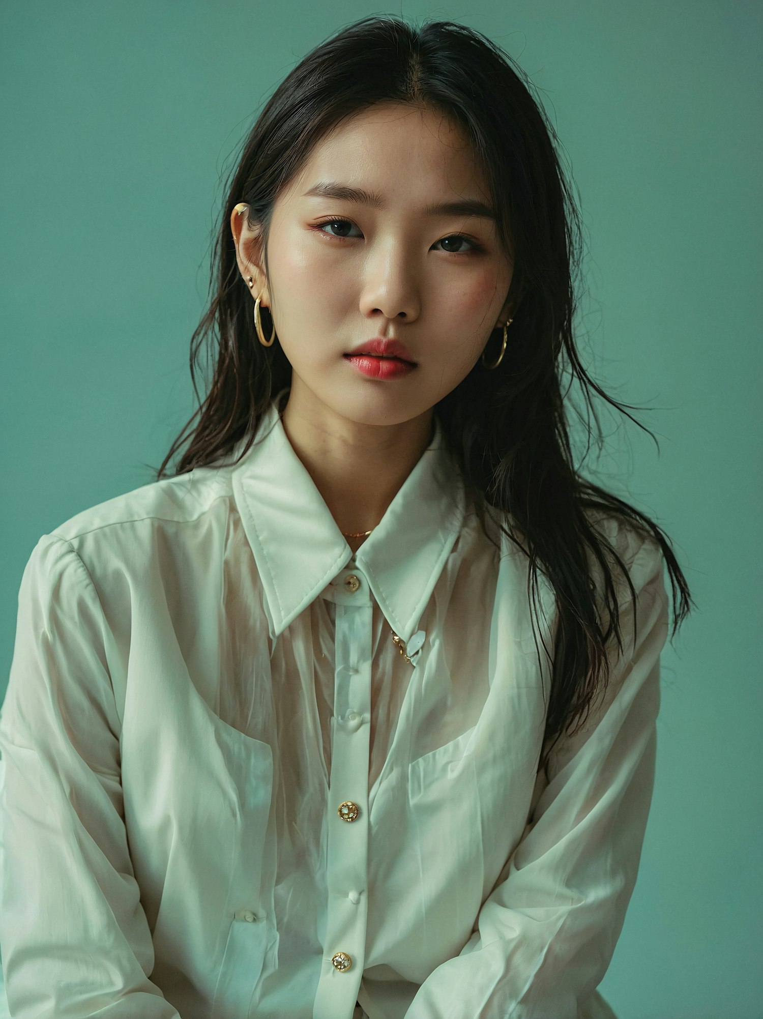 Asian woman in a sheer white blouse with gold buttons, sitting against a green background, wearing gold hoop earrings.