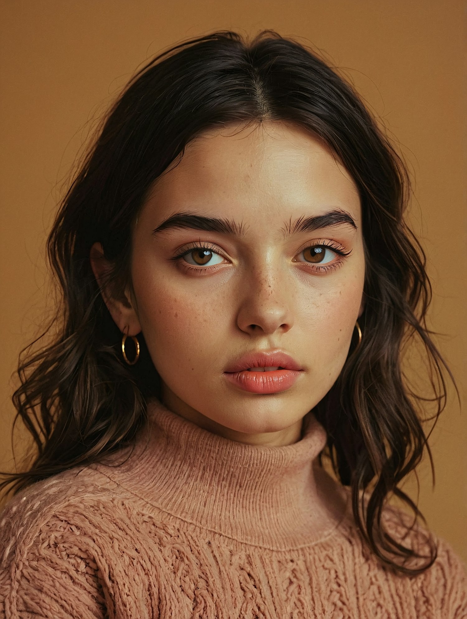 Portrait of a young woman with dark hair and light brown eyes, wearing a knitted turtleneck and gold hoop earrings against a warm background.