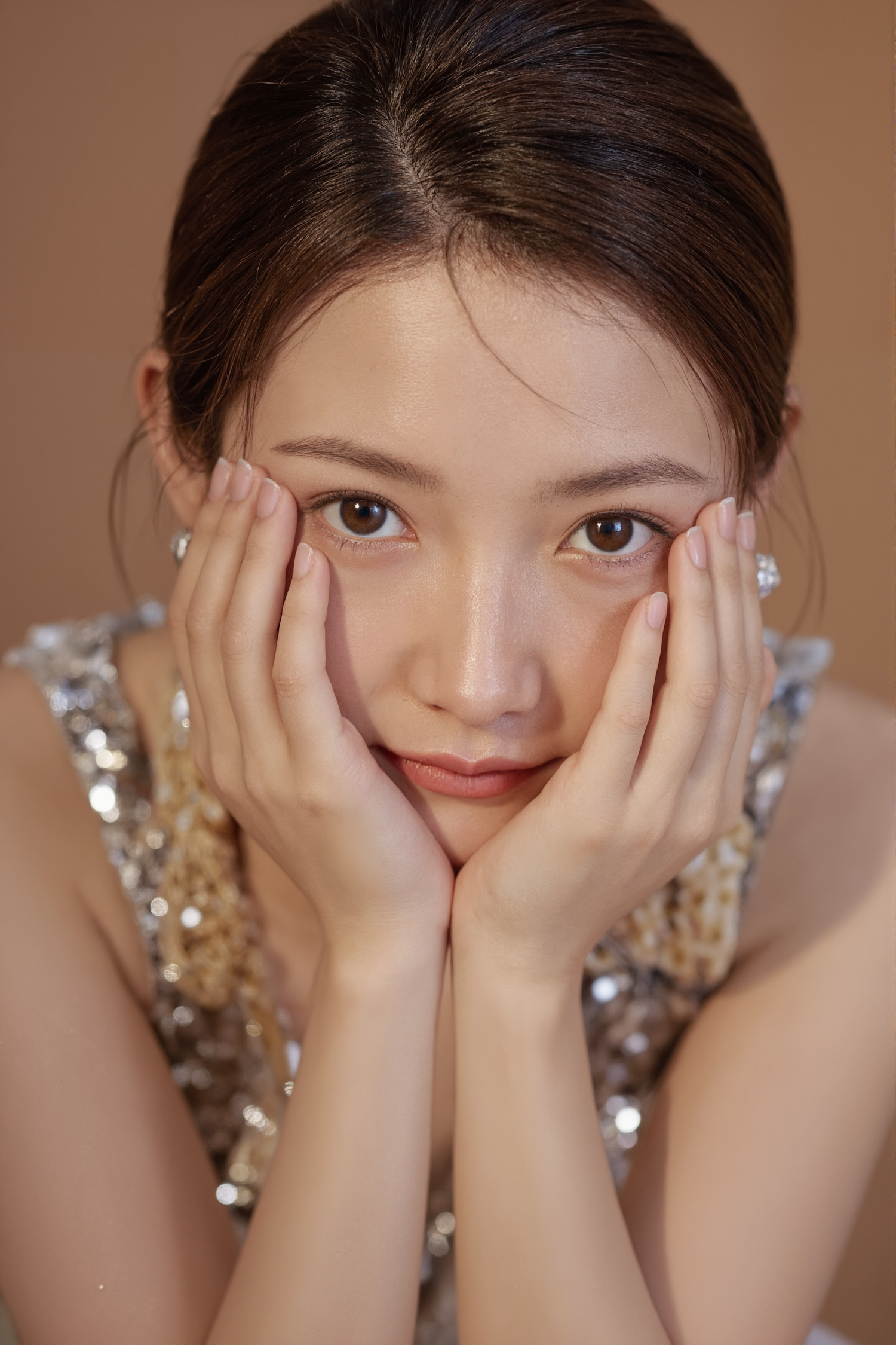 Close-up of an Asian woman with brown eyes and dark hair, resting her face in her hands, wearing a sequined top against a warm brown background.