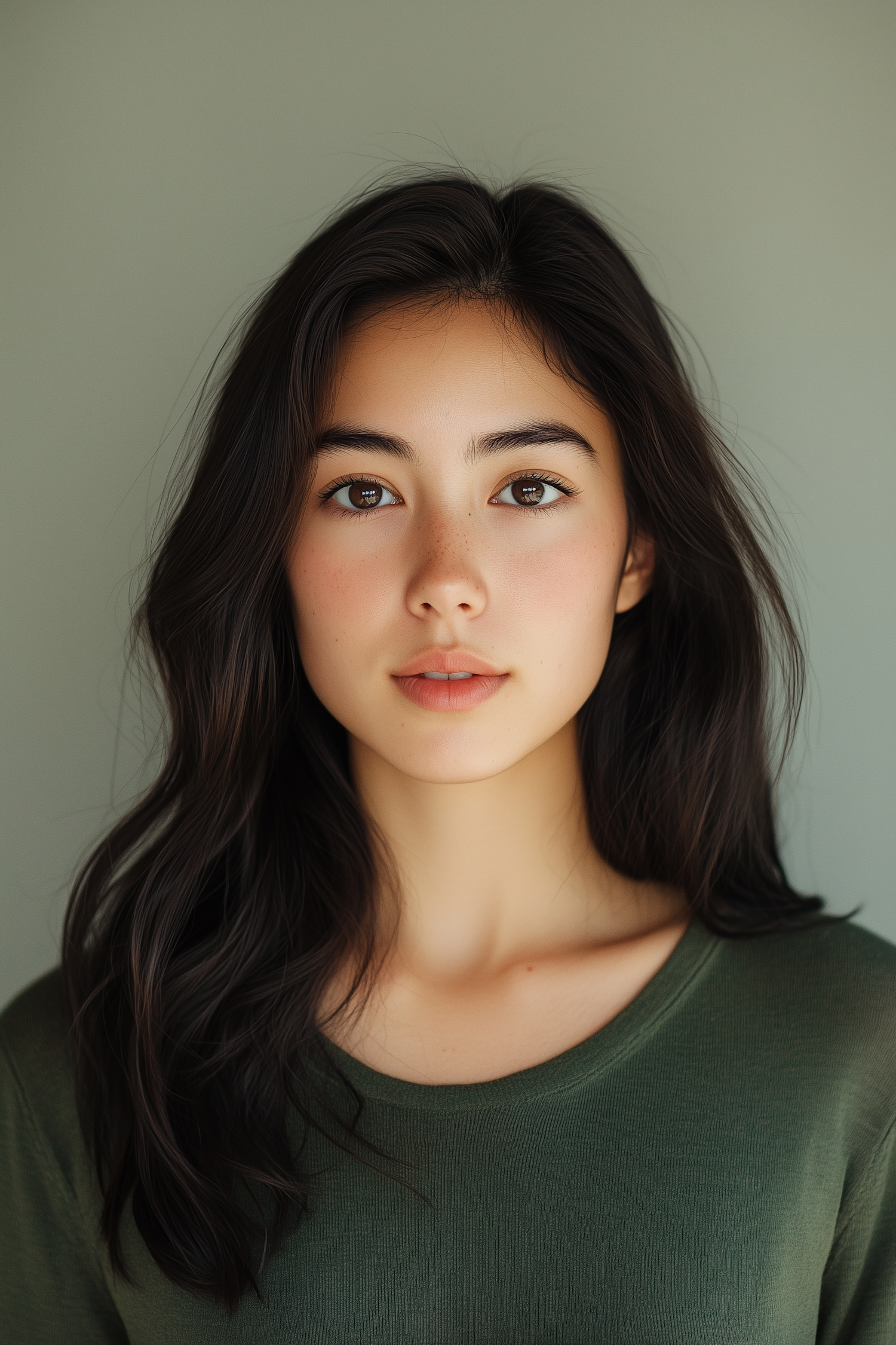 Portrait of a young Asian woman with long dark hair and serene expression, wearing a green top against a neutral background.