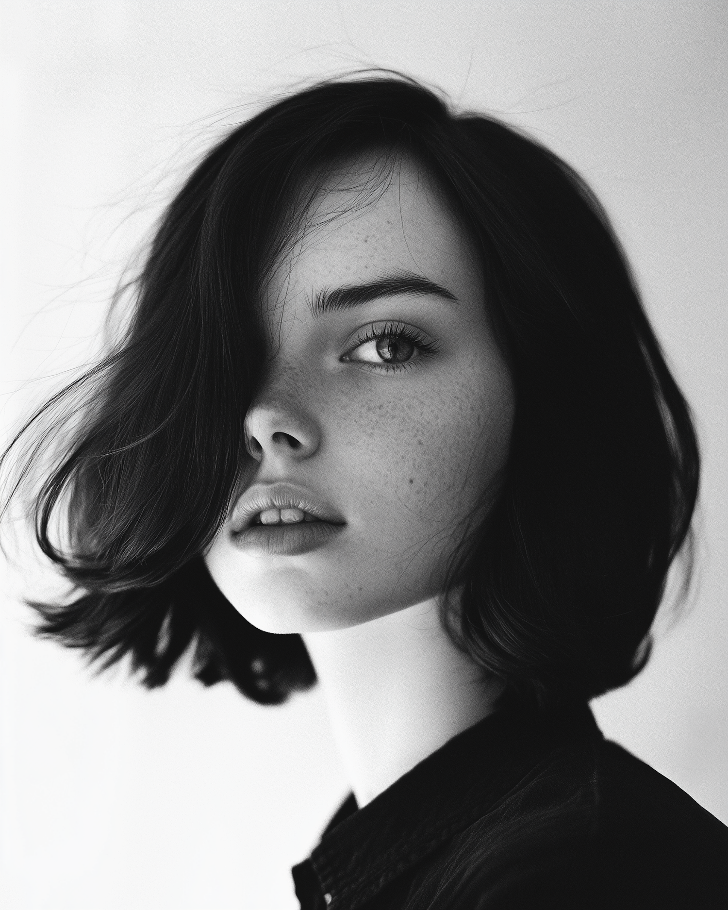 Monochrome portrait with flowing dark hair and blurred face, wearing a dark jacket. Mysterious and stylish with a soft gray background.
