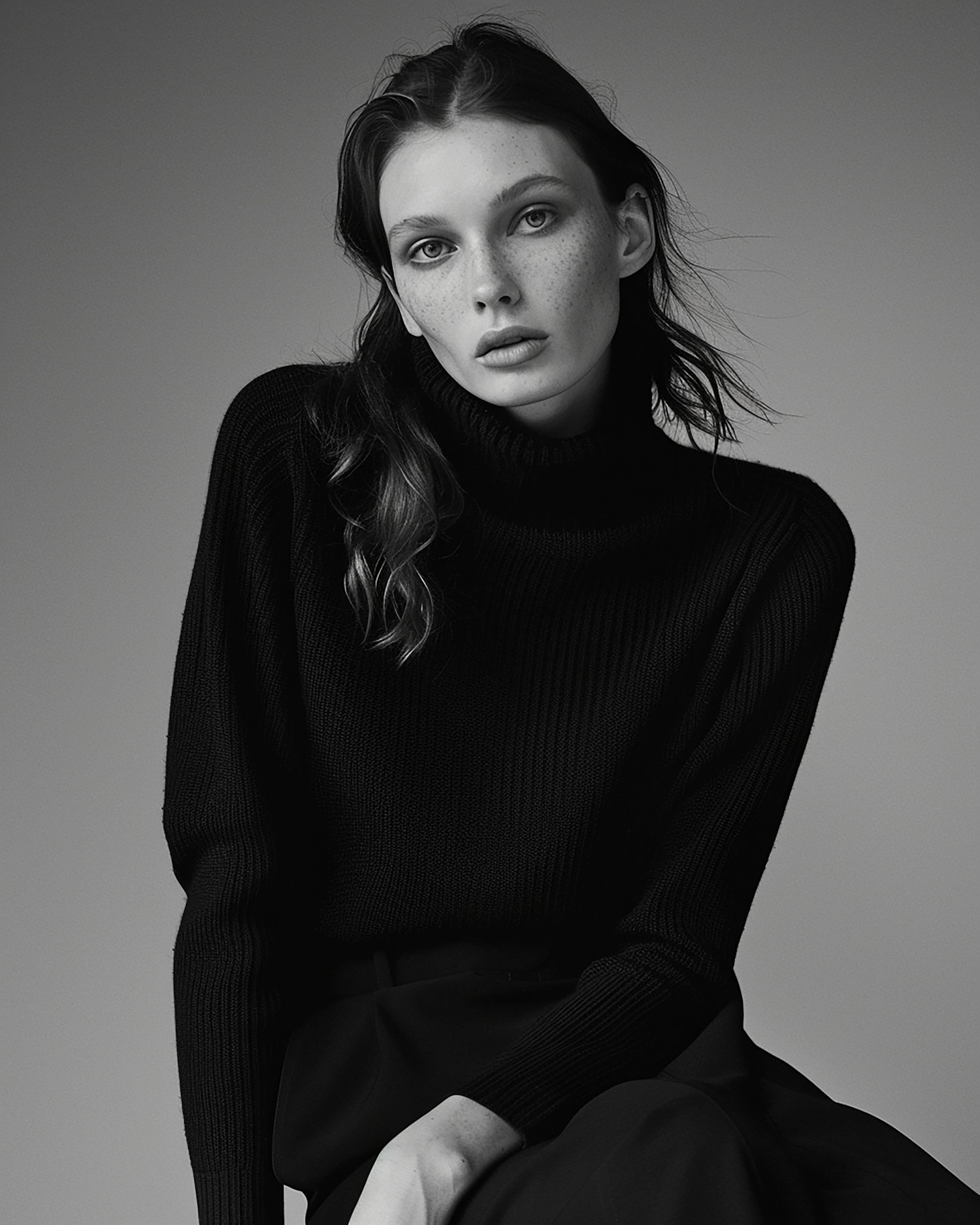 Monochrome portrait of a young woman in a black turtleneck, with freckles and long dark hair, exuding elegance and introspection.
