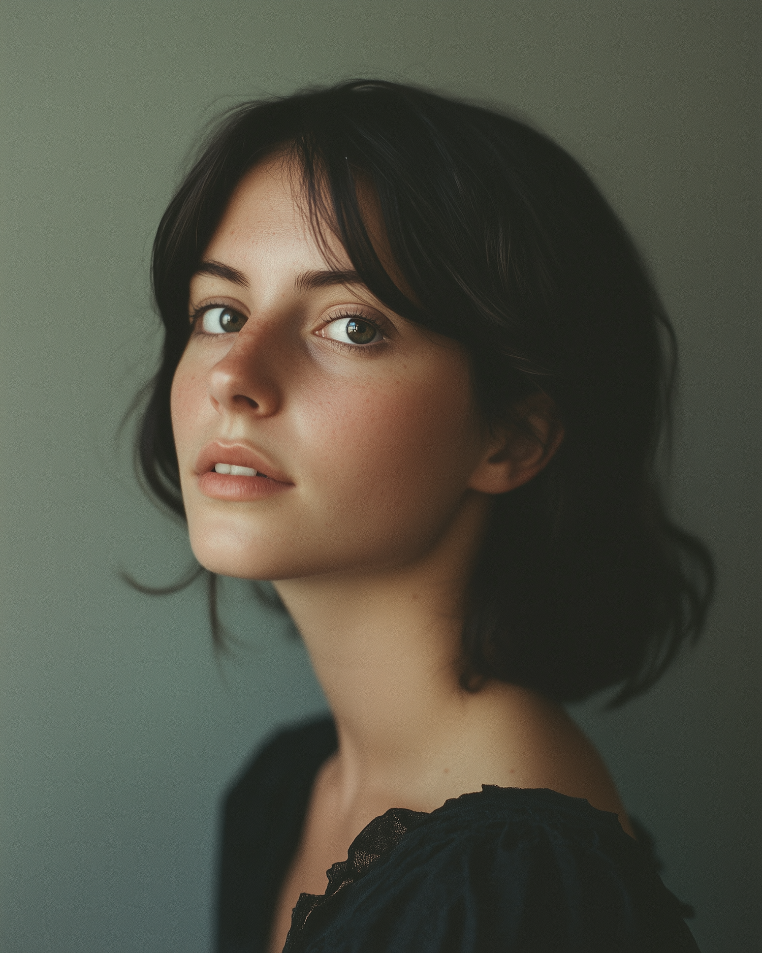 Portrait of a young woman with dark hair and expressive eyes, wearing a dark top with lace detailing. Soft, serene expression.