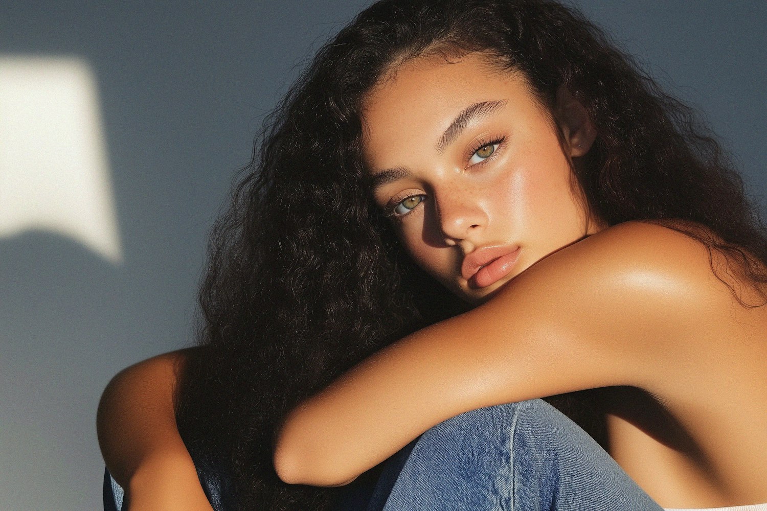 Young woman with curly dark hair and light green eyes, wearing denim. Soft lighting highlights her natural beauty and calm expression.