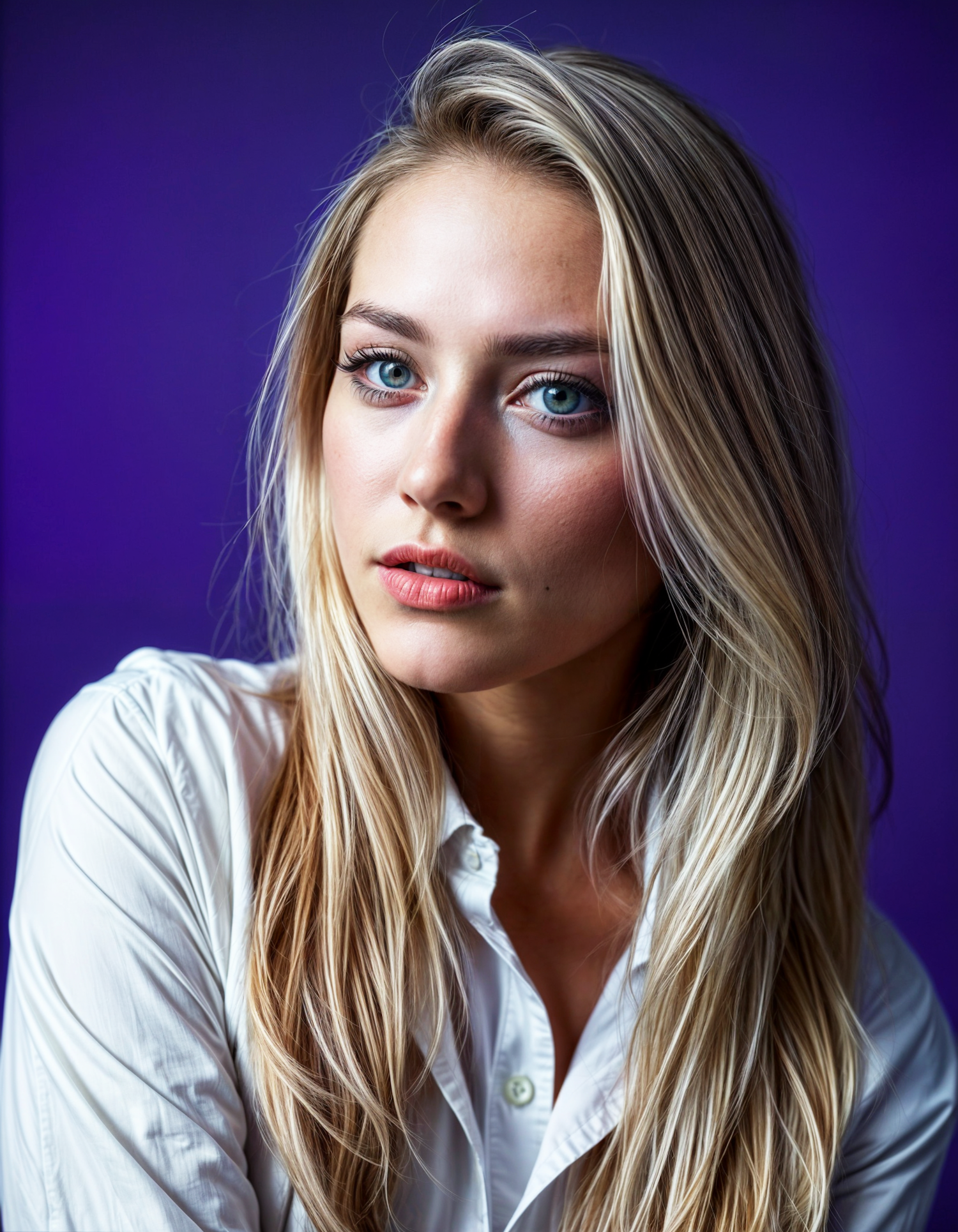 Portrait of a young woman with blonde hair and blue eyes against a purple background, wearing a white shirt.