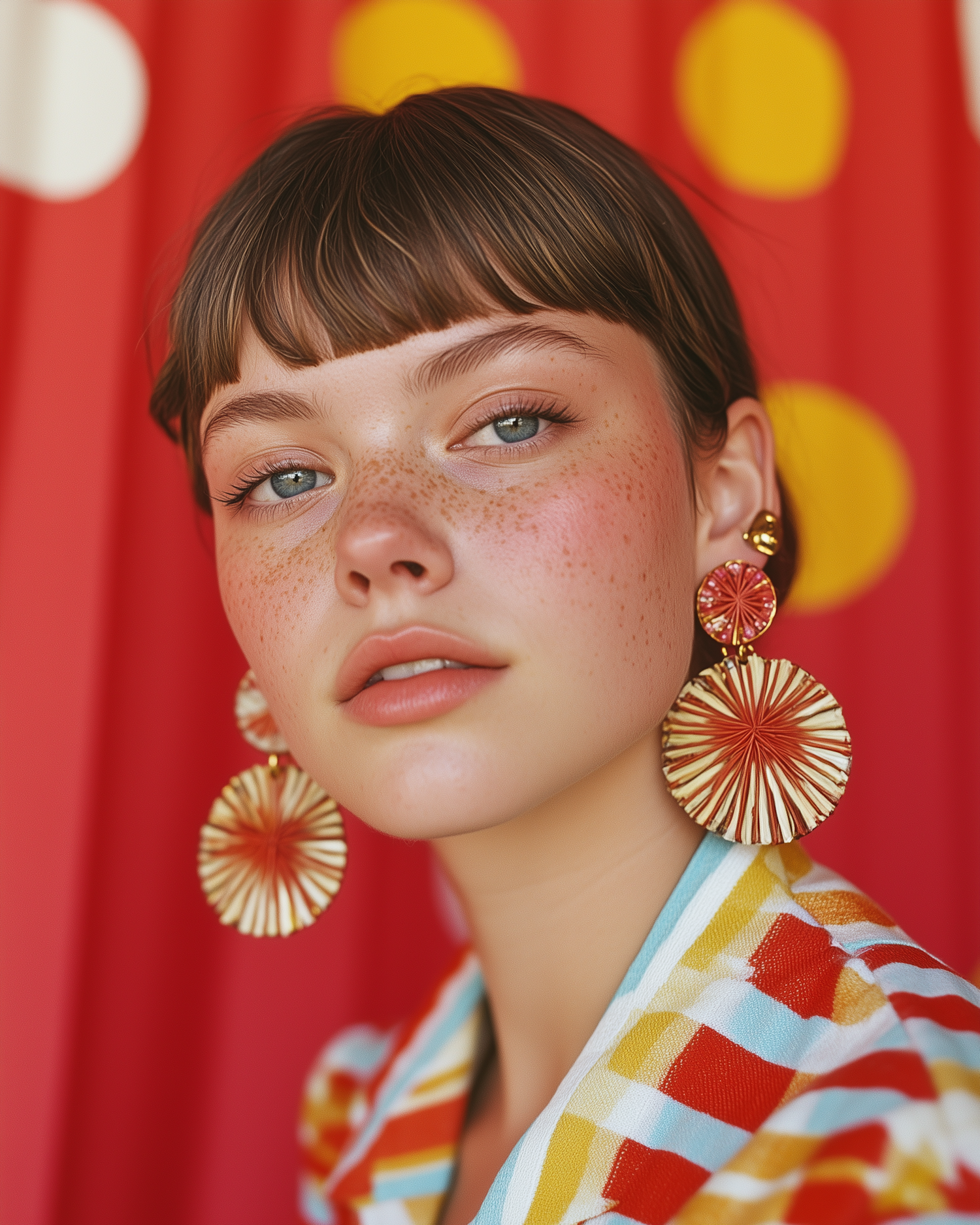 Young woman with freckles and large earrings against a vibrant polka dot background, showcasing a colorful and artistic style.