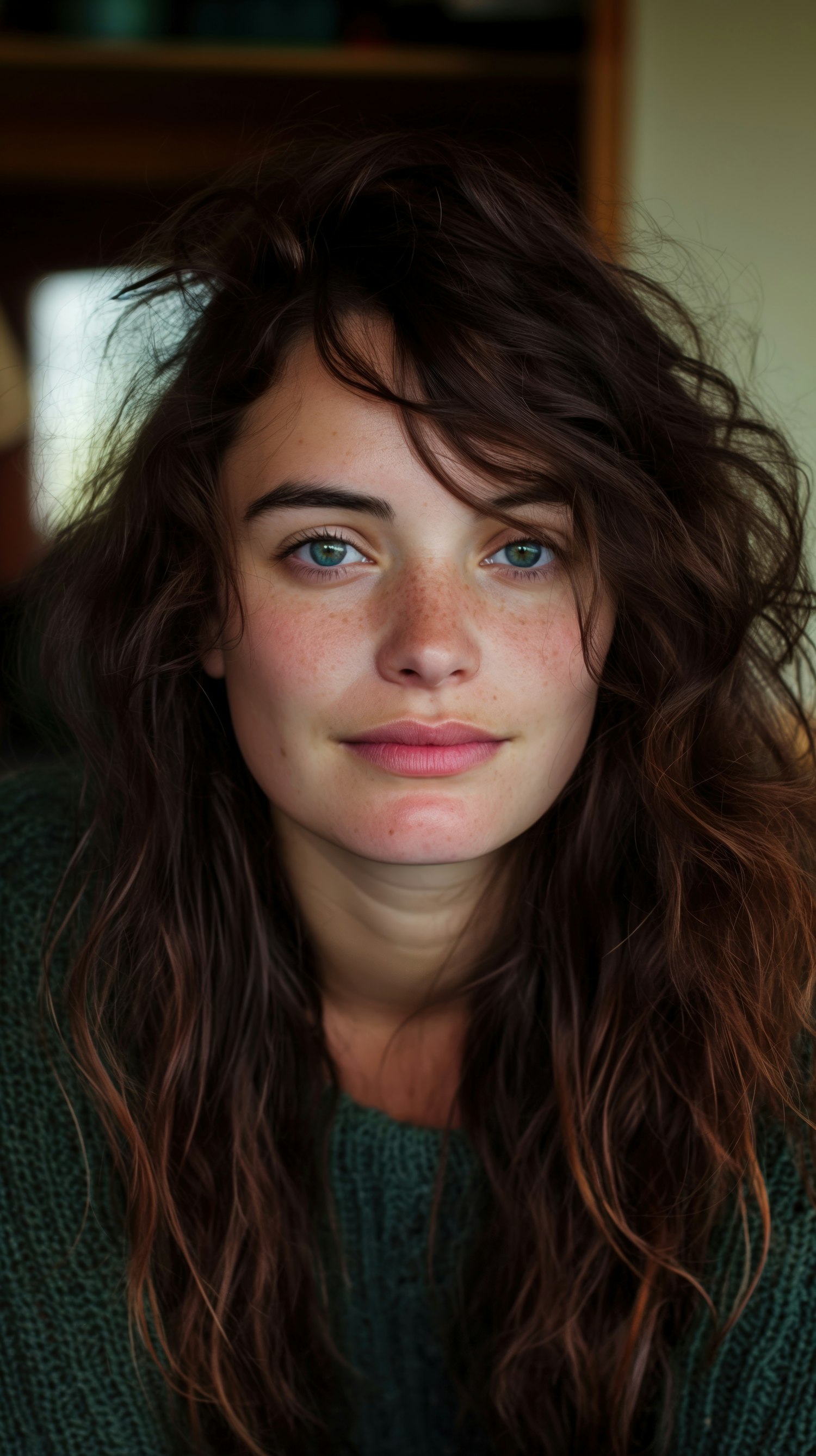 Young woman with wavy brown hair and blue eyes, wearing a green sweater. Calm expression with freckles and a gentle smile.