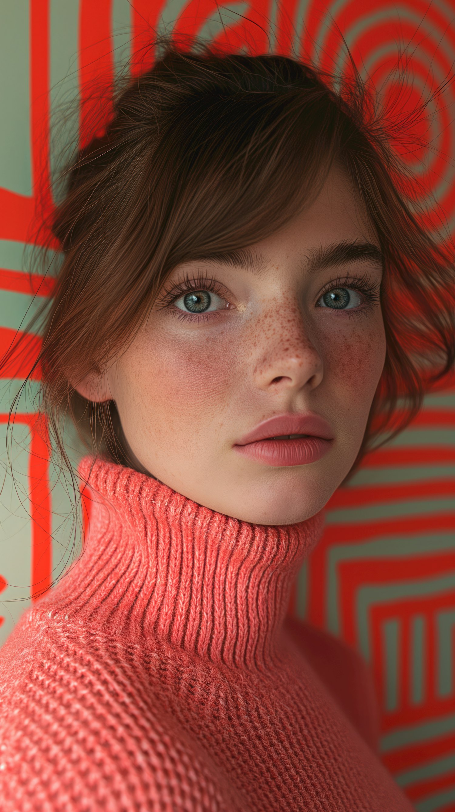 Portrait of a young woman with freckles, blue eyes, and a coral sweater against a geometric red and green background.