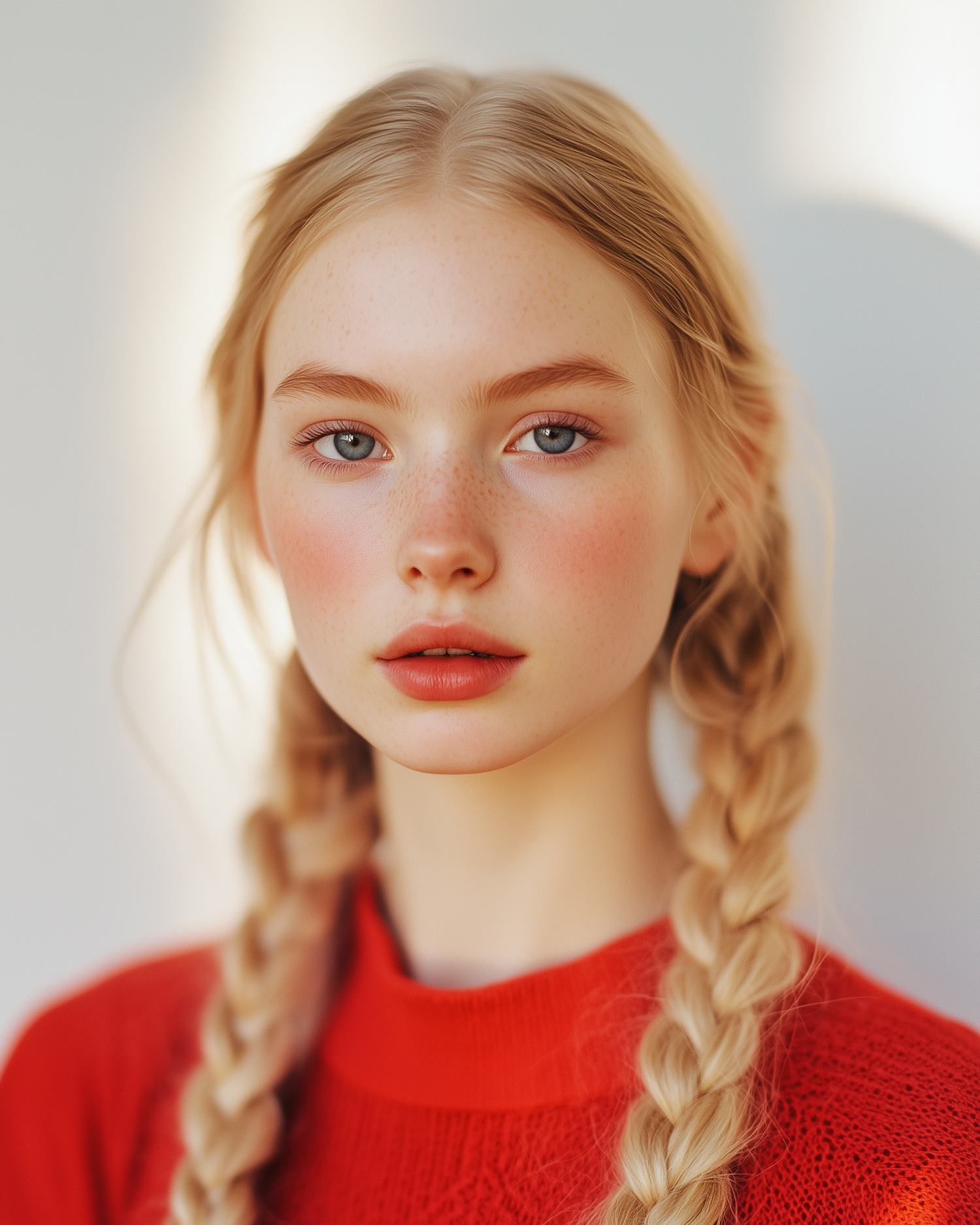 Young woman with blonde braids and a red sweater, face blurred, against a neutral background.