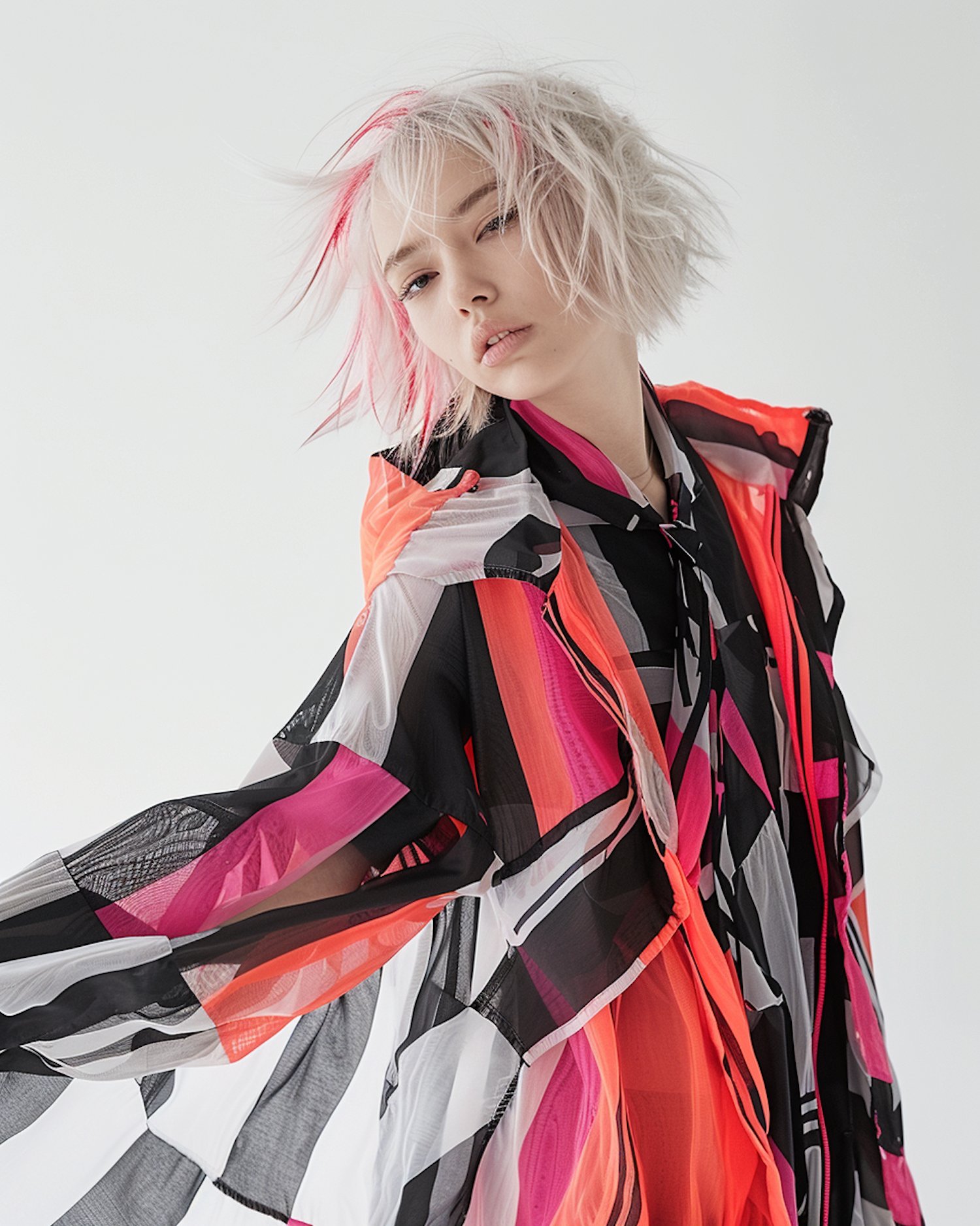 Fashion-forward portrait of a woman with platinum blonde hair and pink highlights, wearing a vibrant geometric patterned outfit.