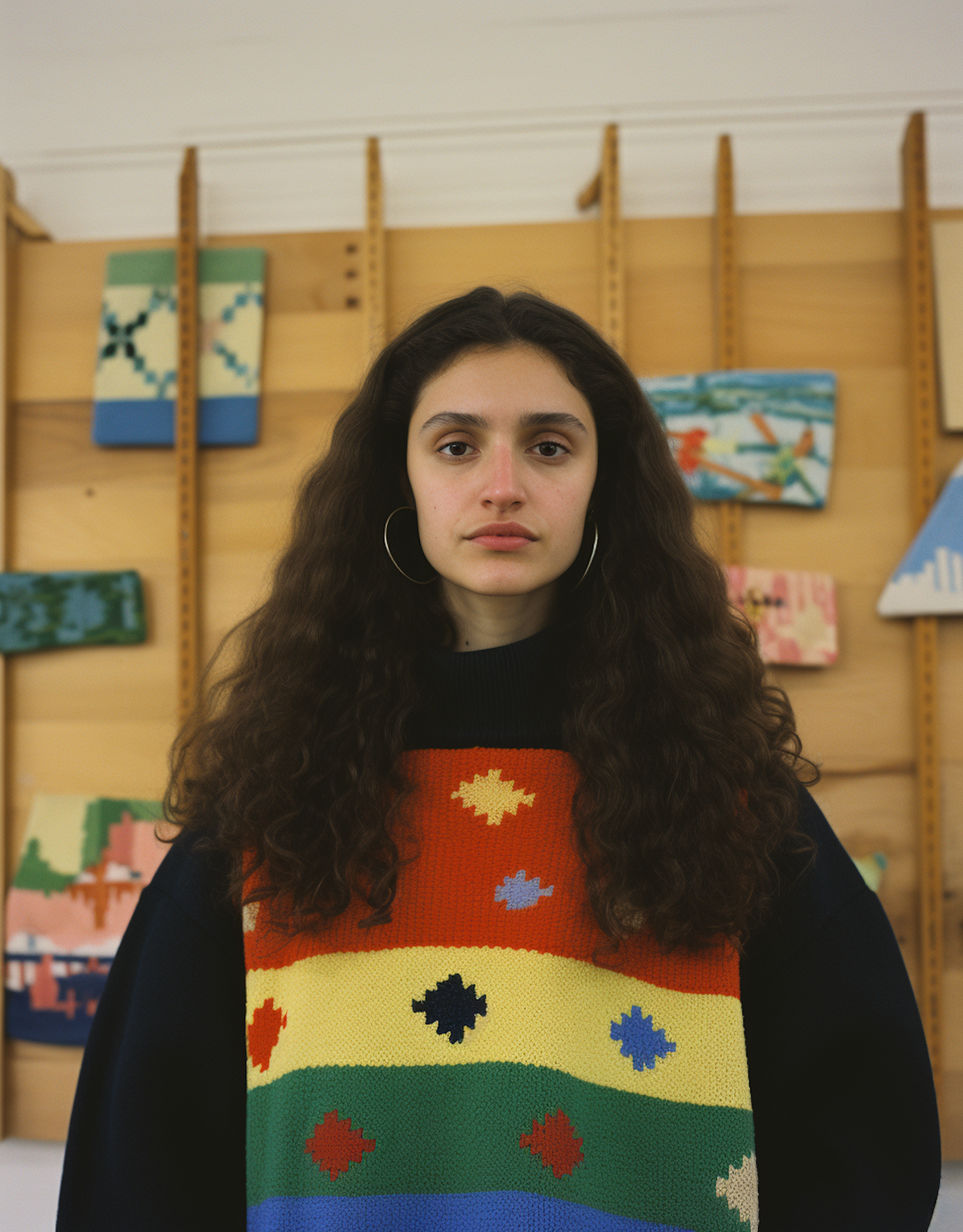 Young woman with curly hair in a colorful sweater, standing in front of textile art on a wooden wall.
