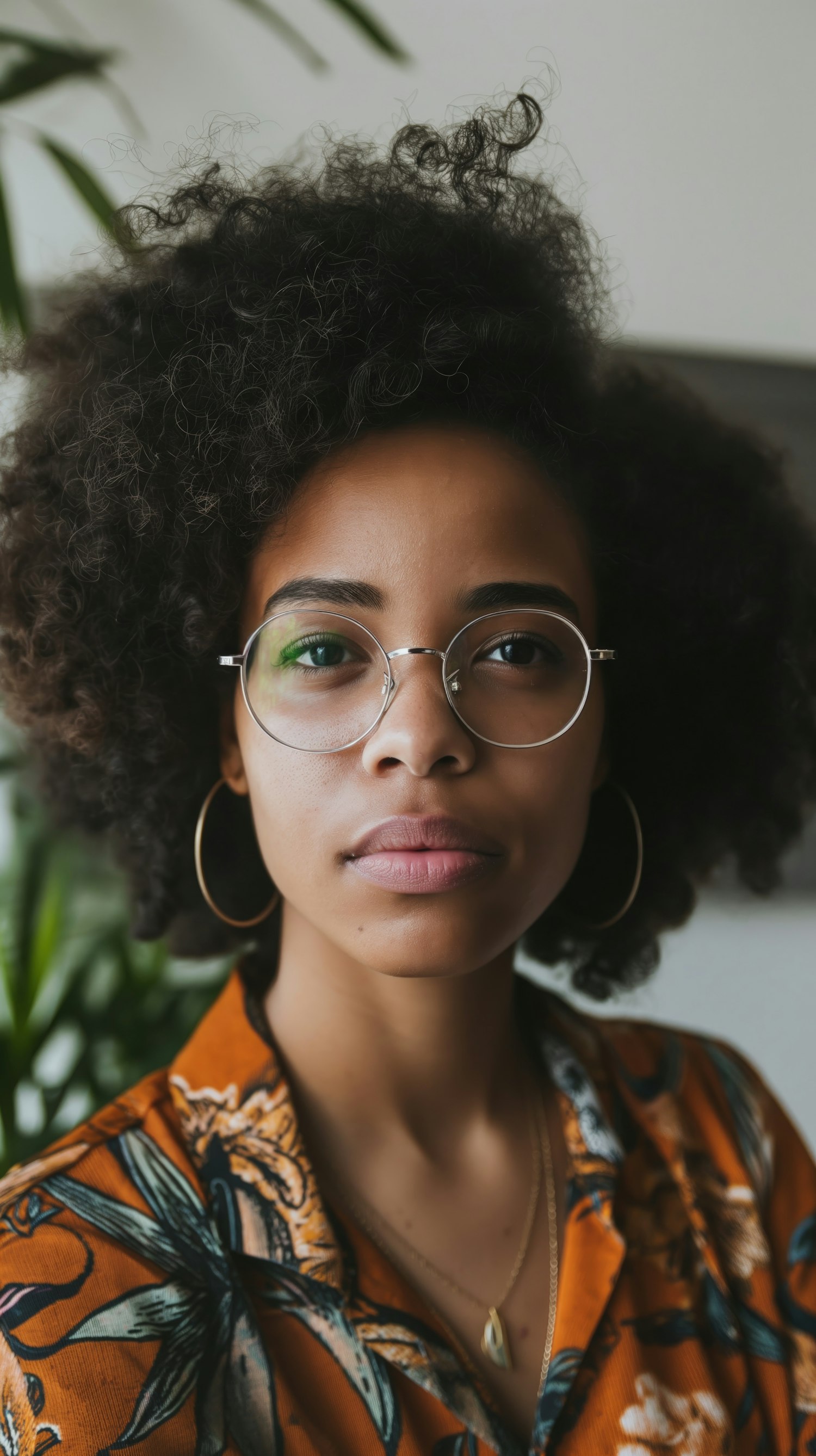 Portrait of a young woman with curly hair, glasses, and floral shirt, exuding confidence and style in a softly blurred indoor setting.