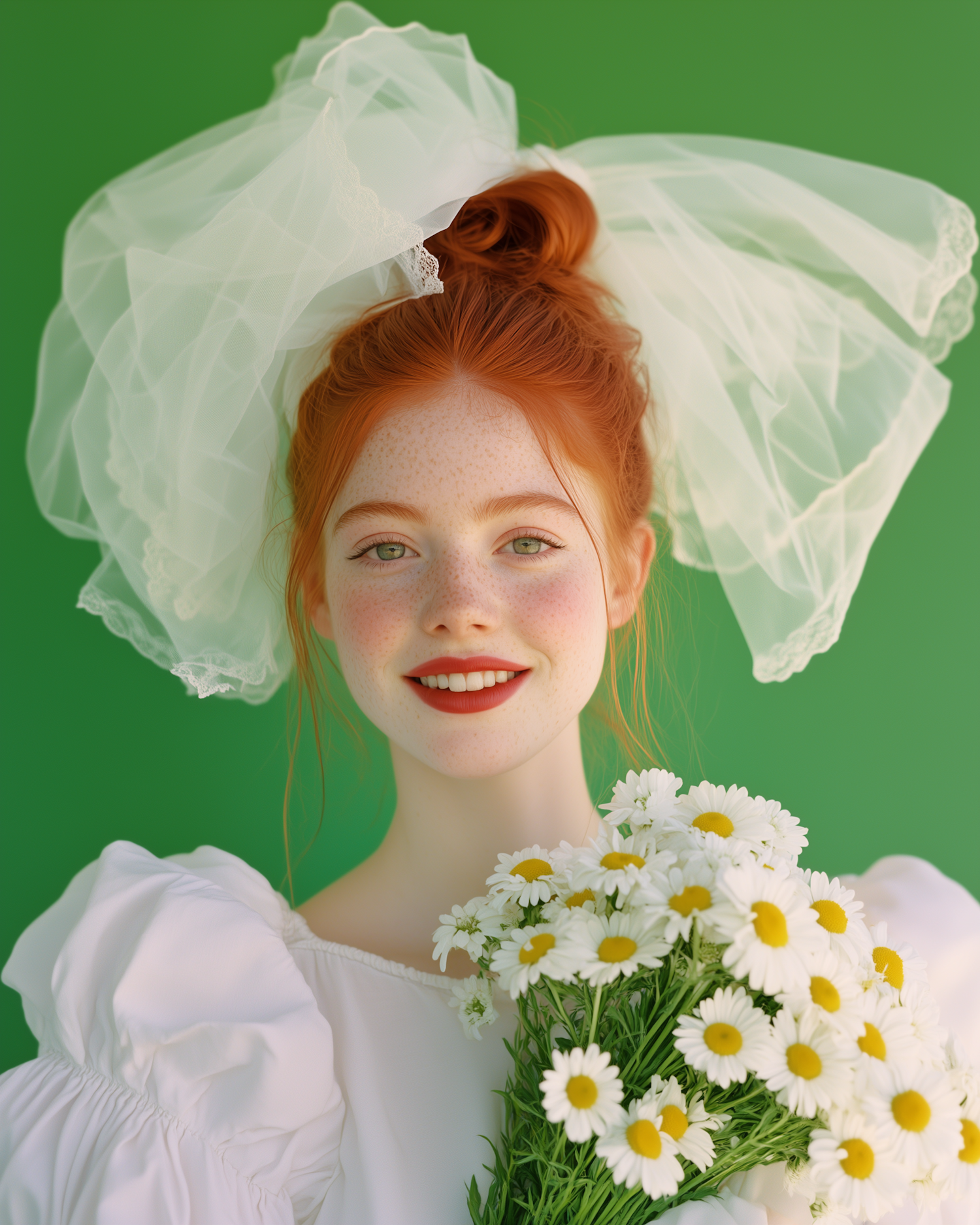 Young woman with red hair and veil holding daisies against a green background, wearing a white dress with puffed sleeves.