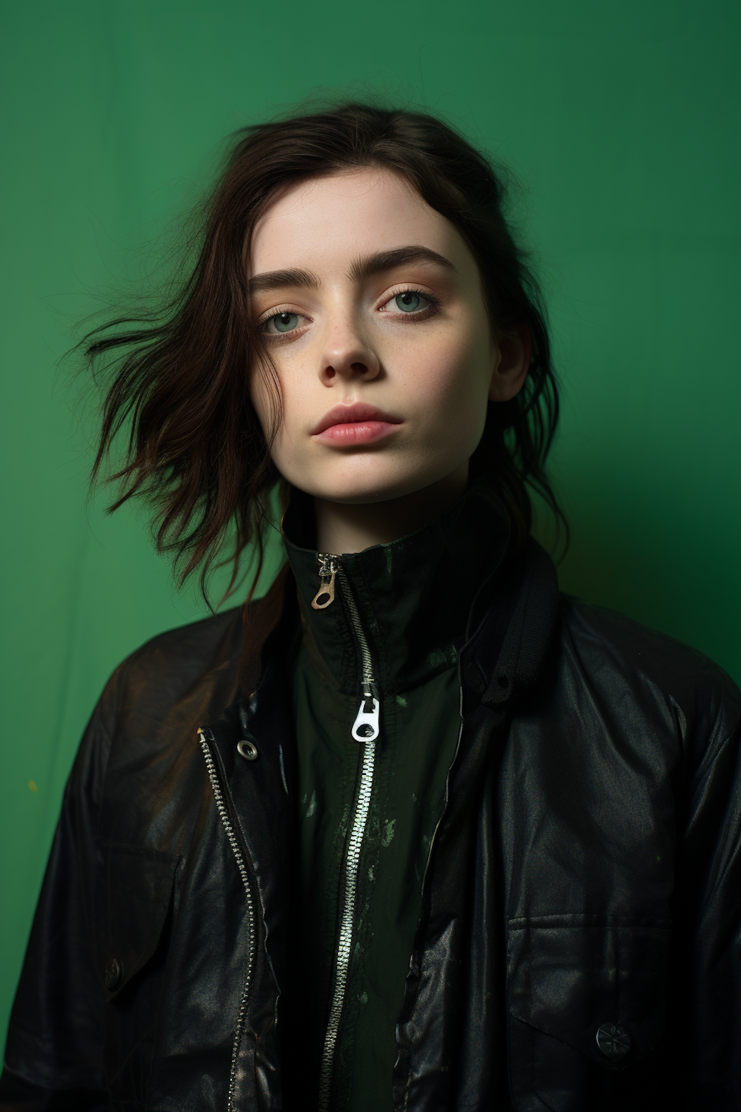 Young woman with blue eyes and dark hair in a leather jacket against a green background, exuding a calm and stylish vibe.