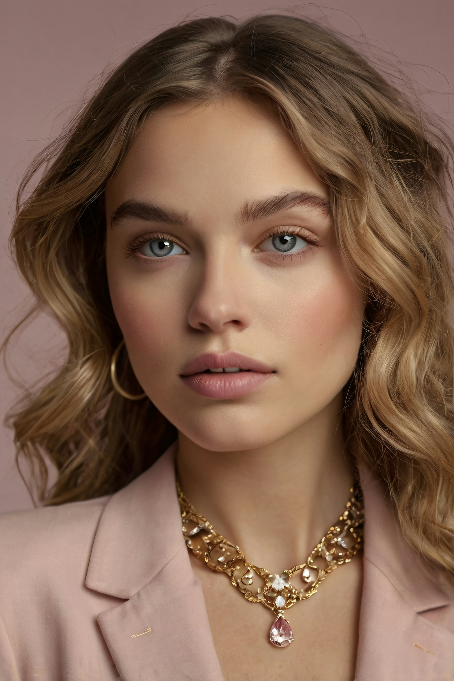 Elegant portrait of a young woman with wavy hair, blue eyes, and a gold necklace with a pink gemstone, set against a soft pink background.