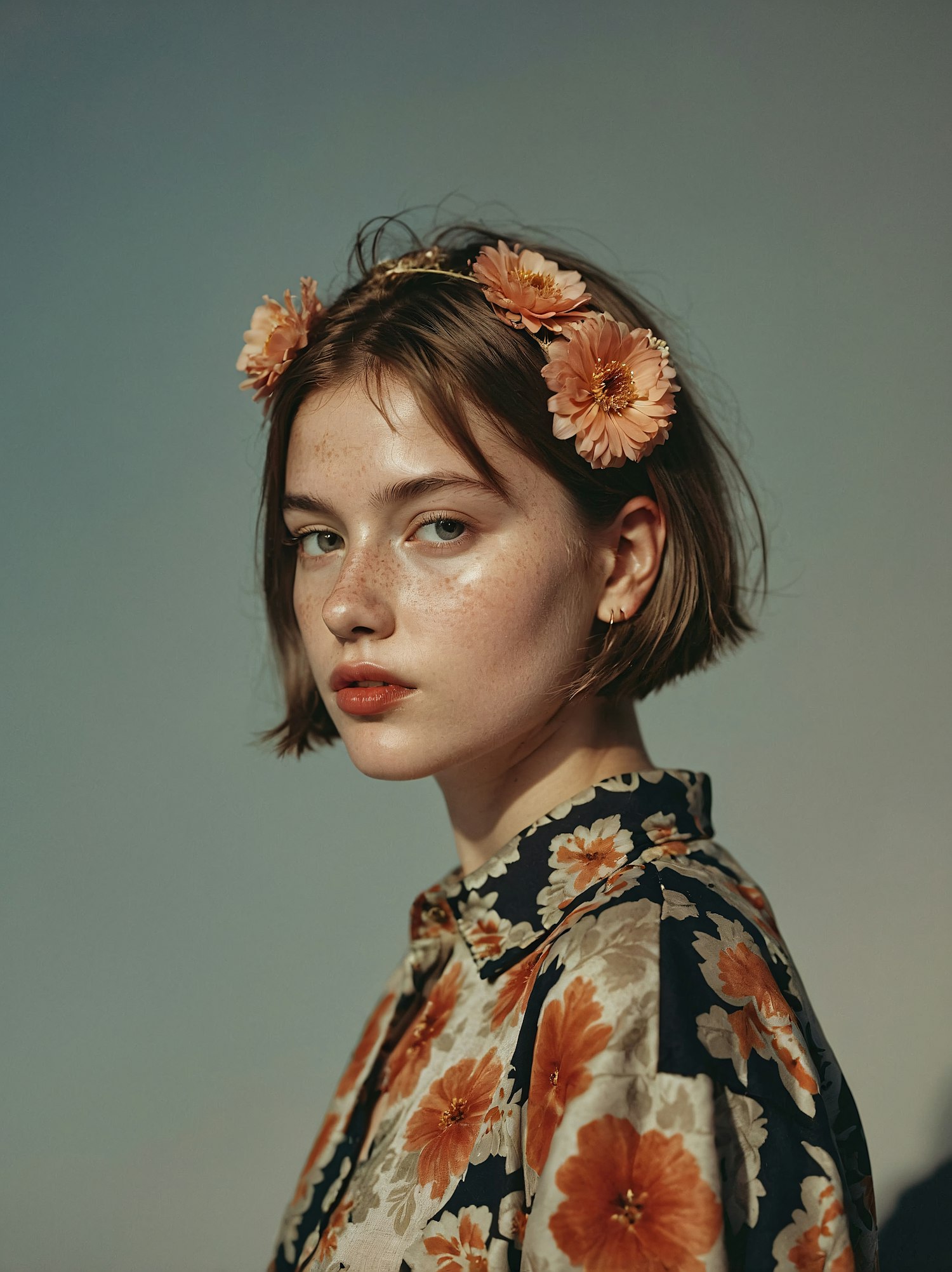 Young woman with floral headband and shirt, gazing softly. Soft lighting and muted blue background create a serene atmosphere.