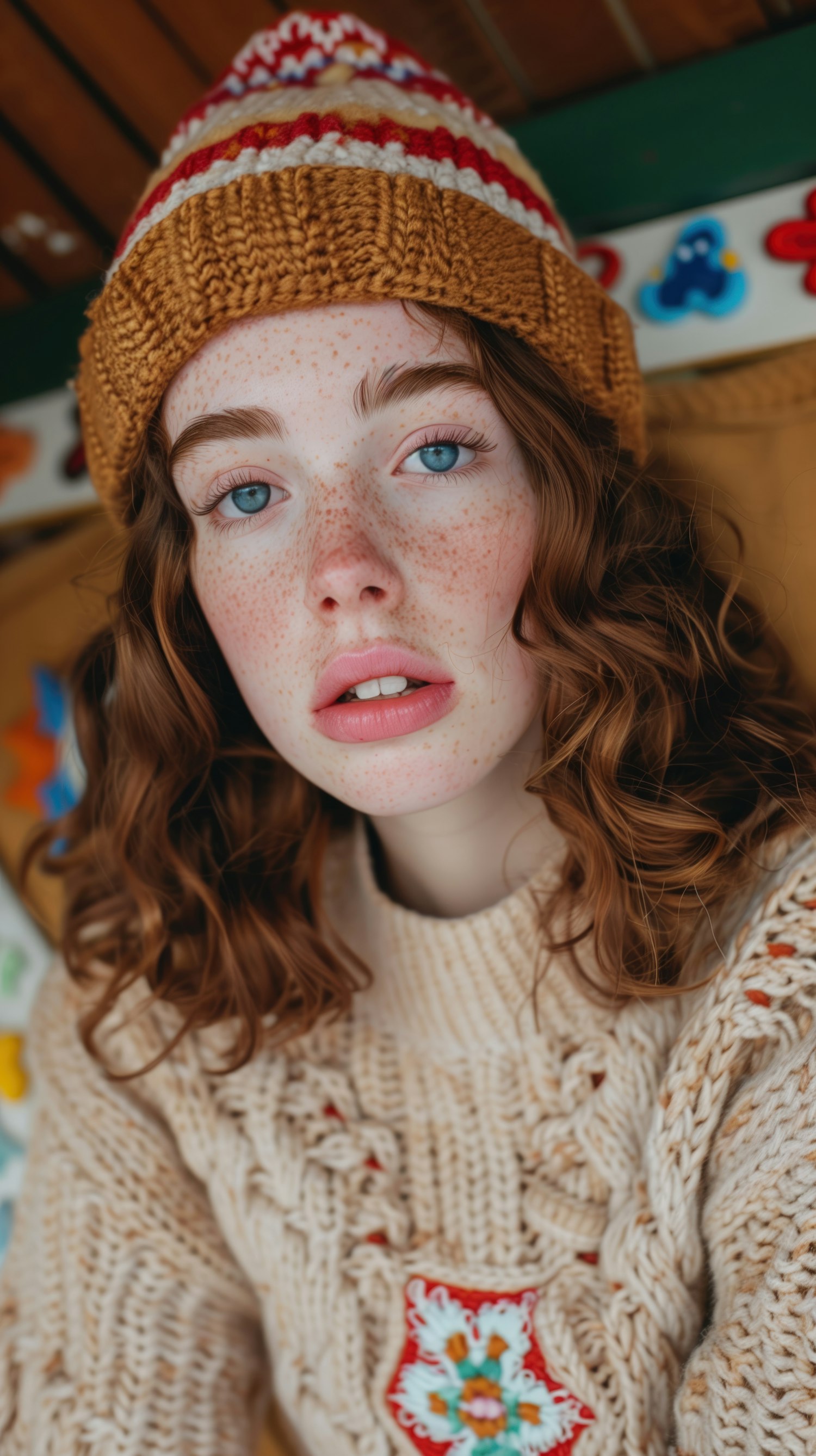 Young woman with freckles and blue eyes in a knitted beanie and sweater, gazing directly at the camera with a neutral expression.