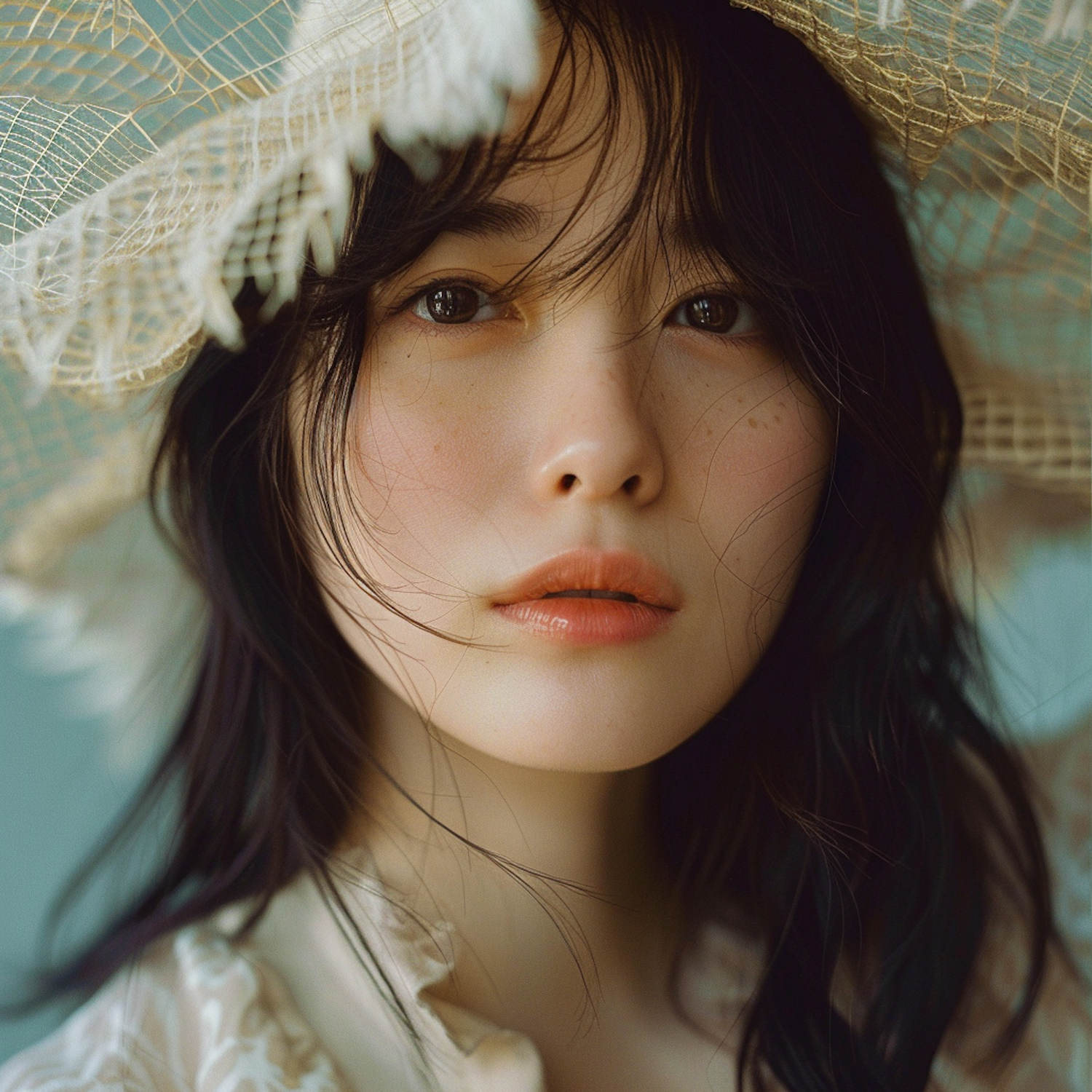 Portrait of a young woman in a straw hat, with soft lighting and a serene expression, set against a muted teal background.