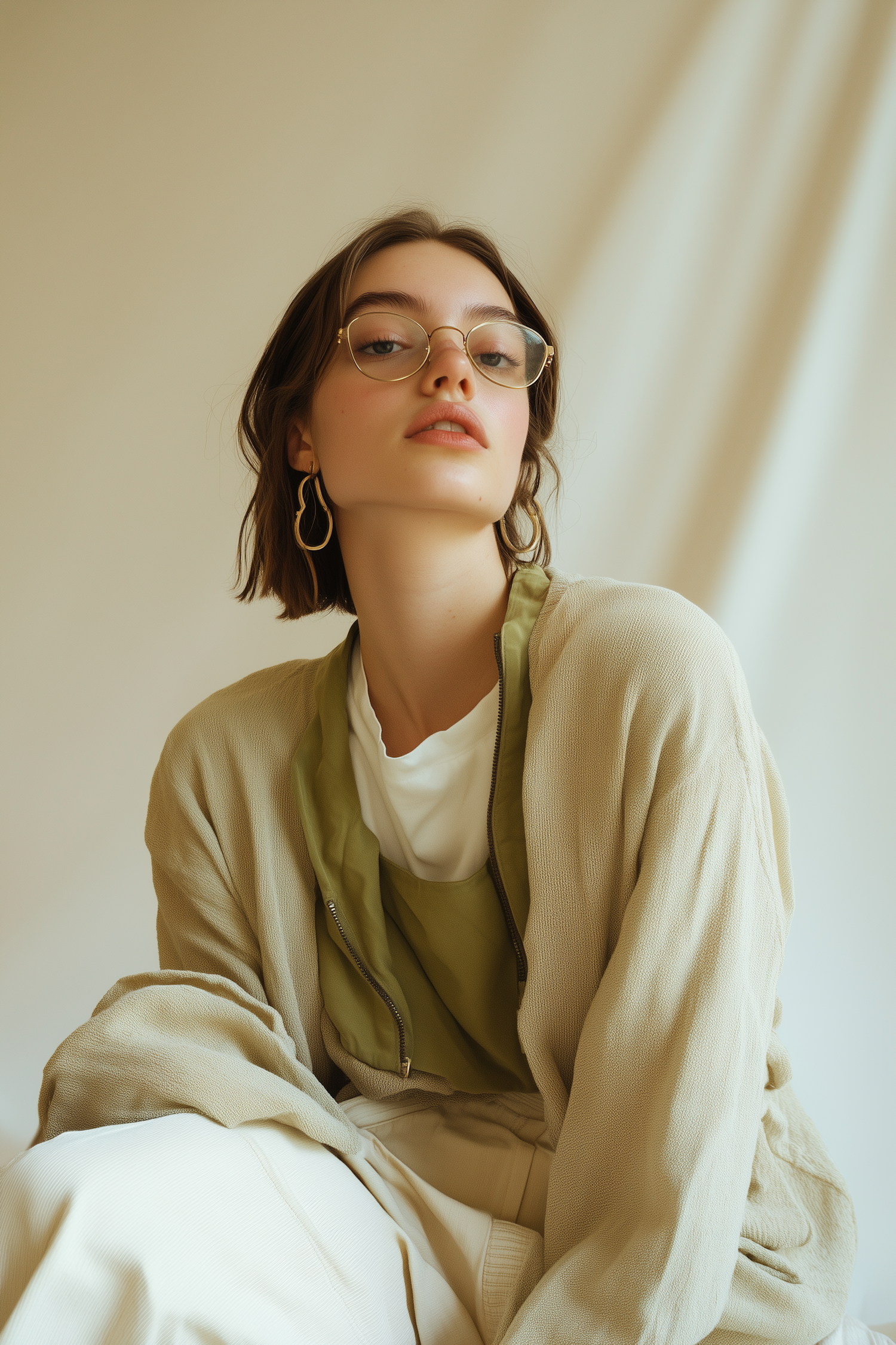 Stylish woman with glasses and gold earrings in a beige cardigan, exuding elegance and confidence against a neutral background.
