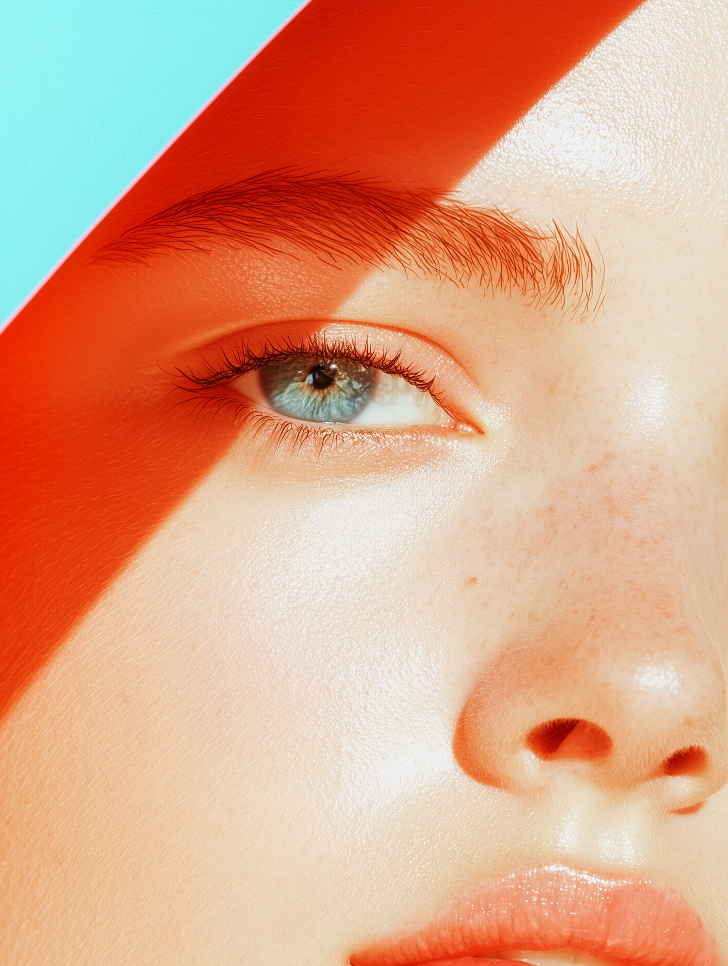 Close-up of a blue-eyed face with red shadow, fair skin, and freckles. Bold contrast with a bright blue background.