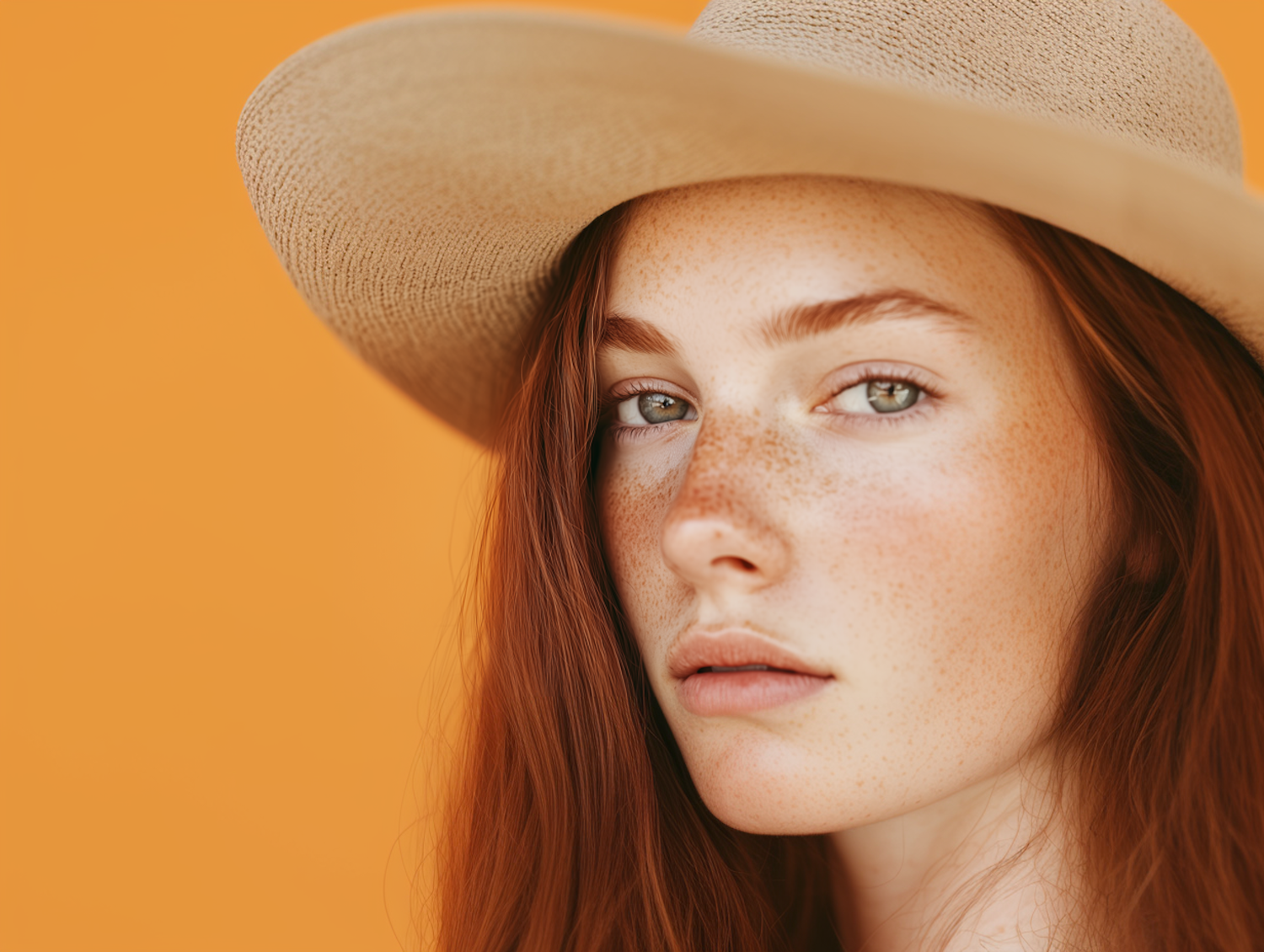 Portrait of a freckled red-haired woman in a beige hat against a vibrant orange background.