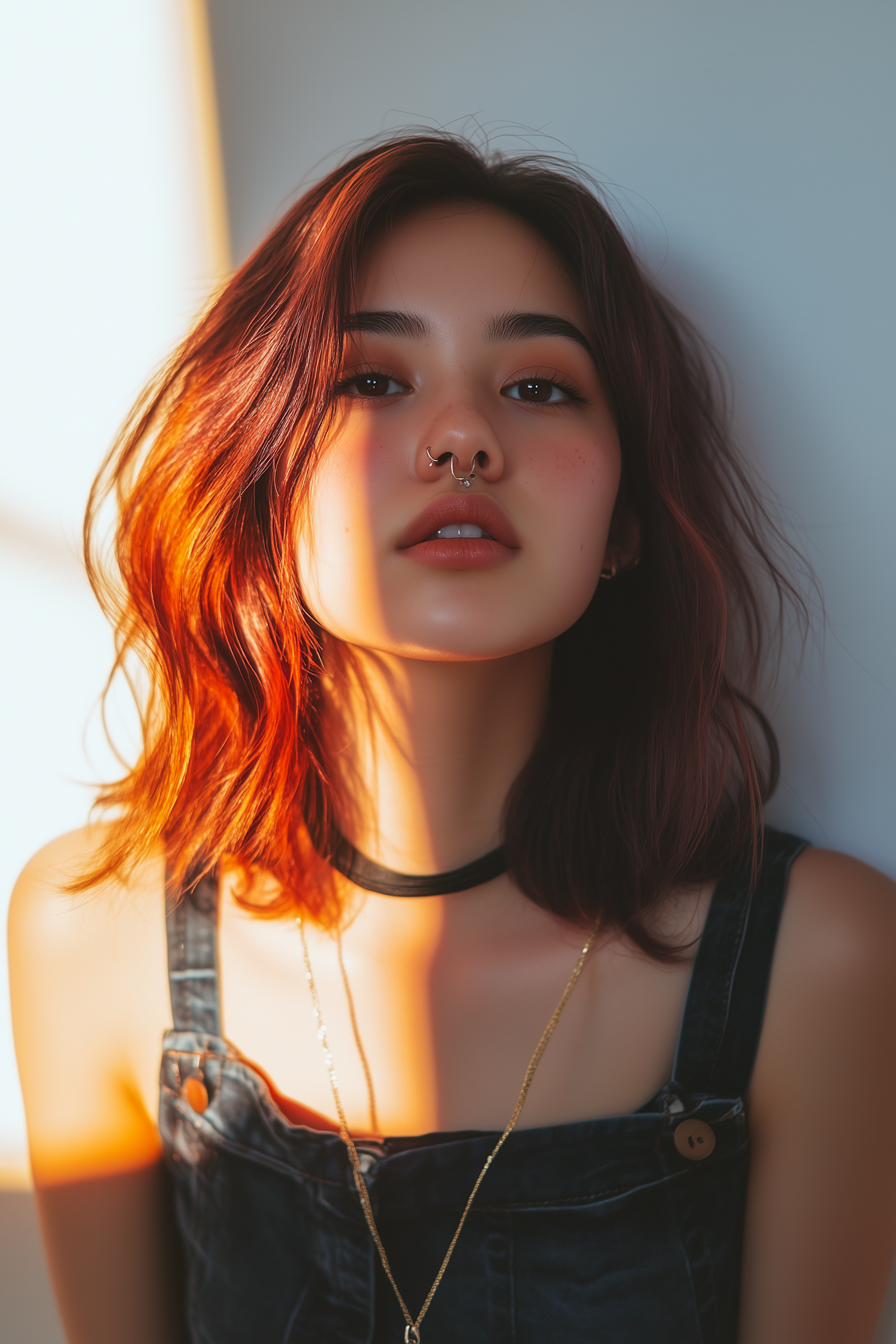 Young woman with auburn hair and septum piercing in sunlight, wearing denim overalls and a choker, exuding confidence.