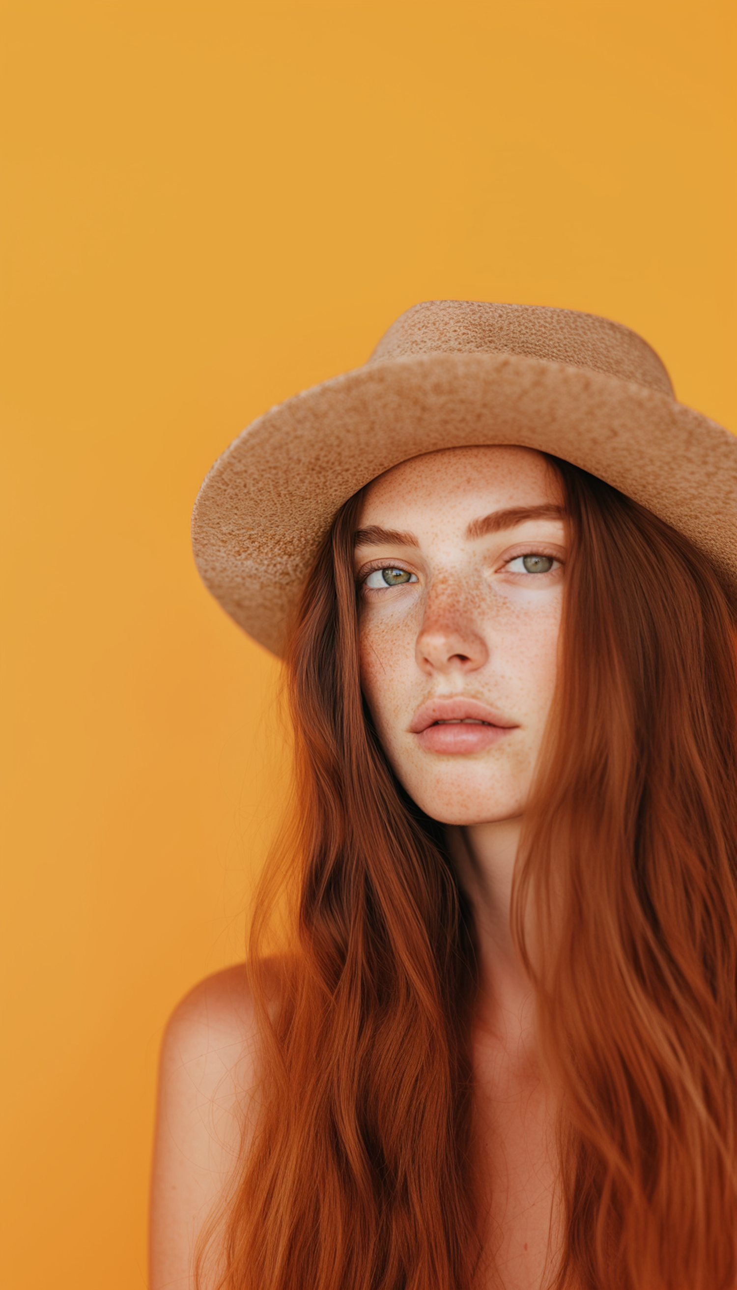 Portrait of a young woman with red hair and freckles, wearing a straw hat against a vibrant orange background.