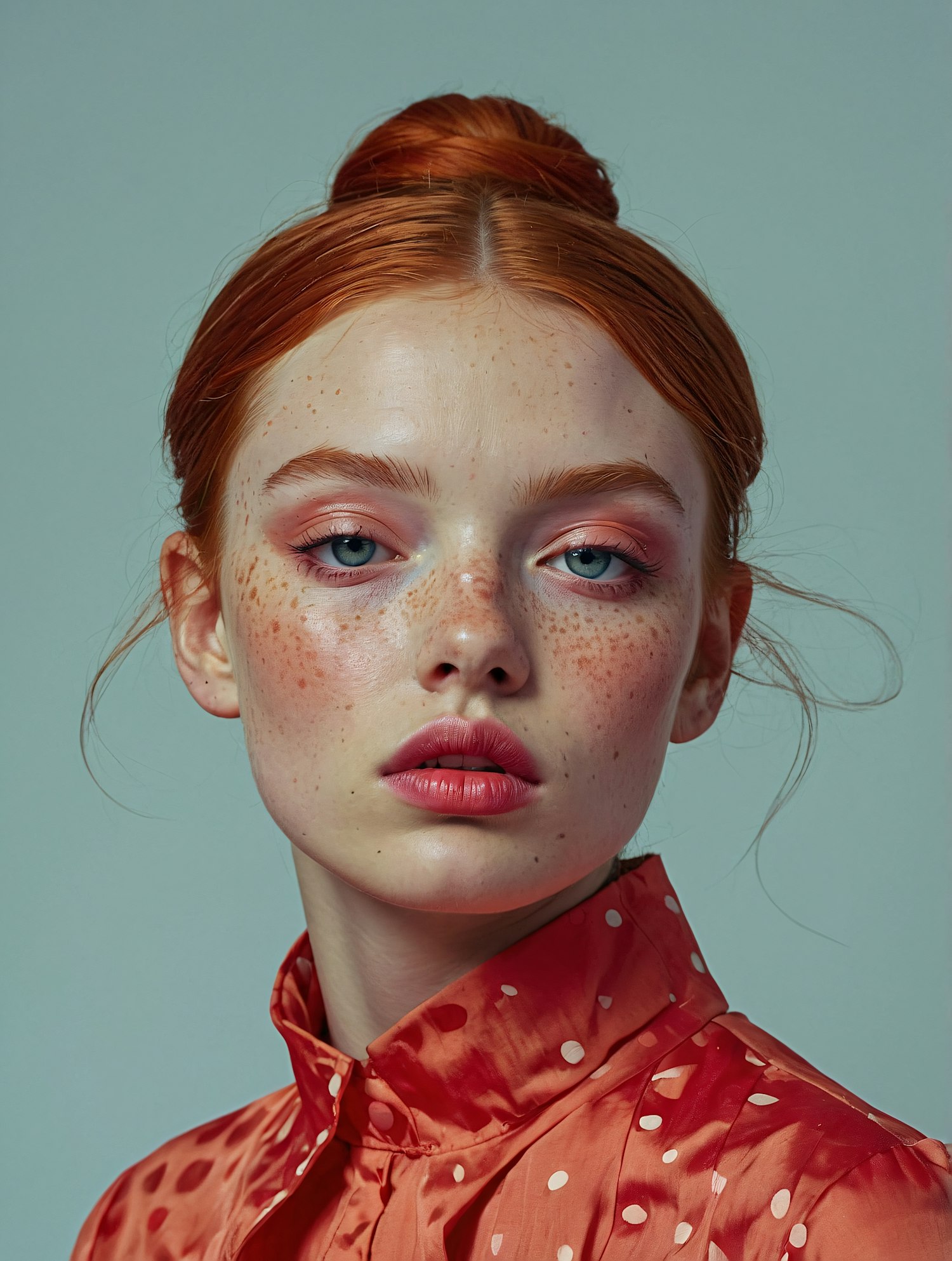Portrait of a young woman with red hair, freckles, and blue eyes, wearing a red polka dot blouse against a muted green background.