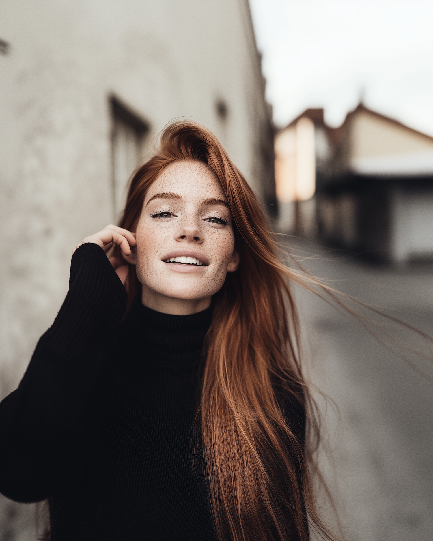 Young woman with long red hair and freckles smiling in a black turtleneck, standing in an urban setting with blurred background.