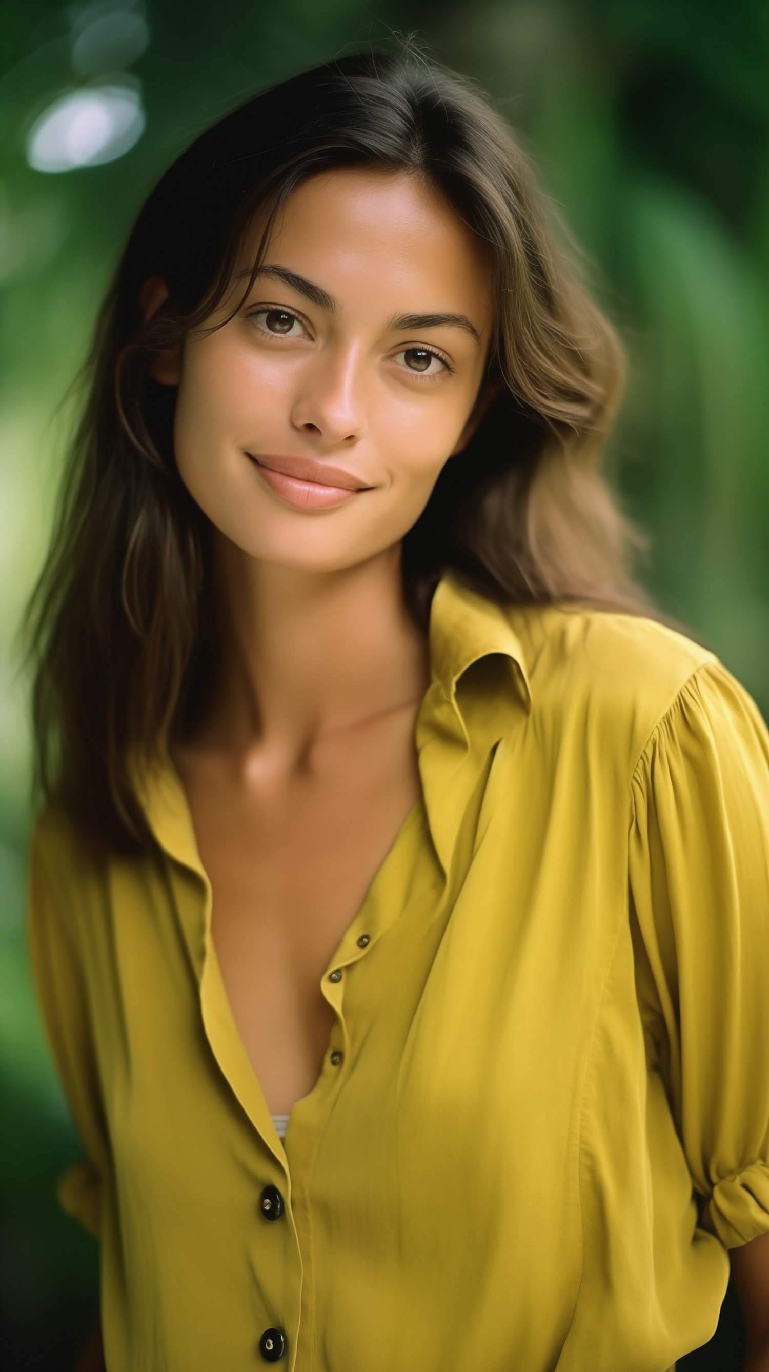 Young woman with dark brown hair and a mustard yellow blouse, smiling softly against a blurred green background.