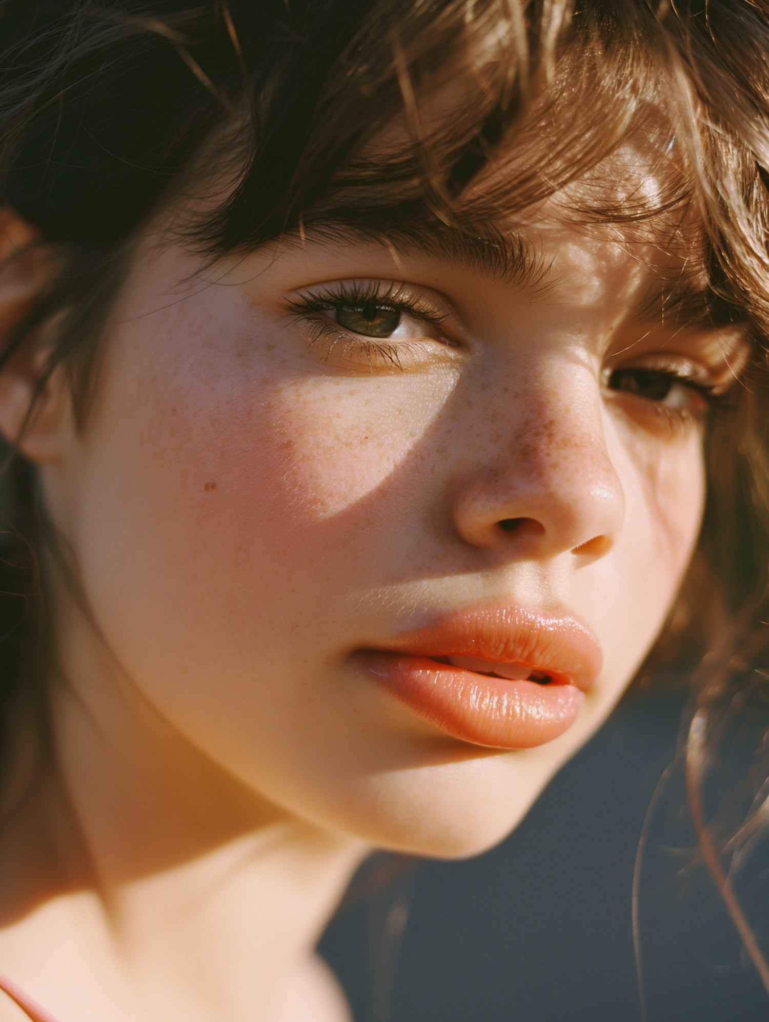 Close-up of a young woman with freckles, green eyes, and glossy lips, bathed in warm sunlight with a serene, natural vibe.
