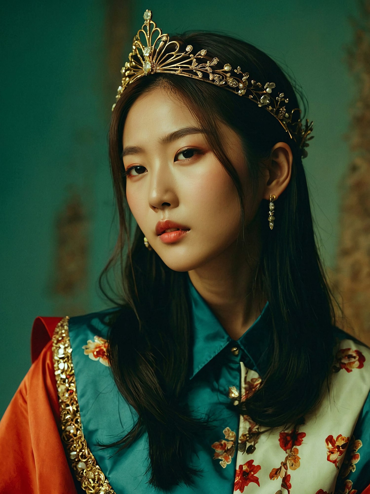 Elegant portrait of an Asian woman wearing a gold tiara and floral attire, exuding grace and sophistication.