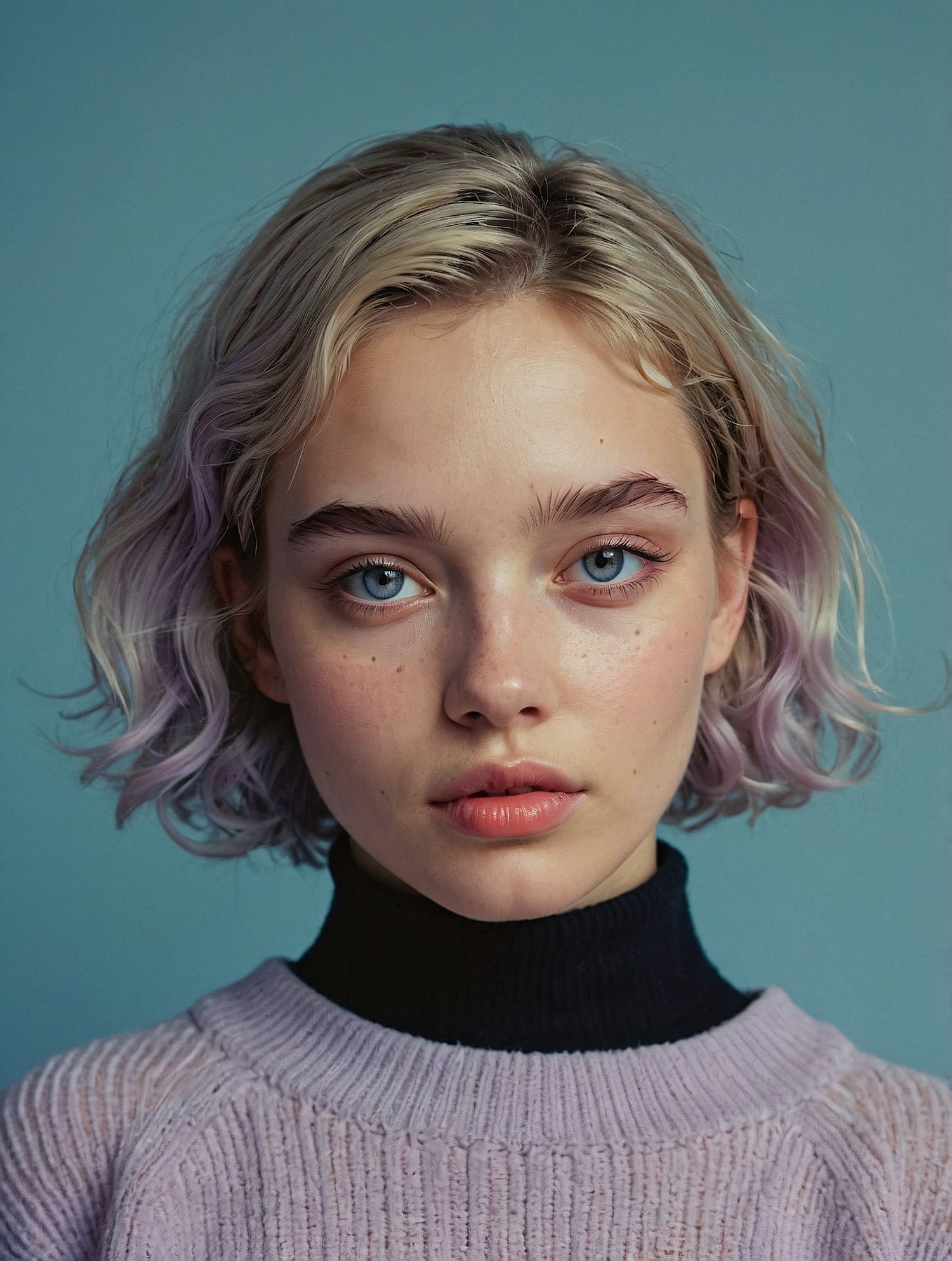 Portrait of a young woman with blonde hair and blue eyes, wearing a purple sweater and black turtleneck against a blue background.