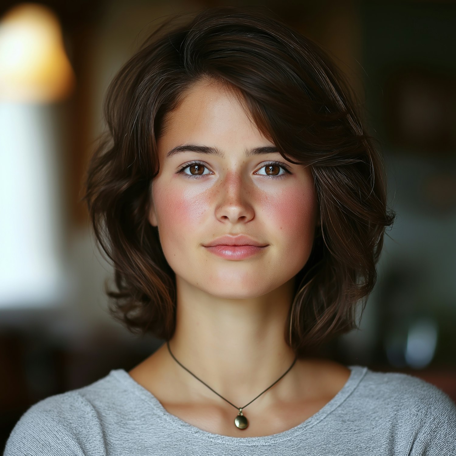 Portrait of a young woman with wavy brown hair, fair skin, and a calm expression, wearing a gray top and necklace in warm lighting.