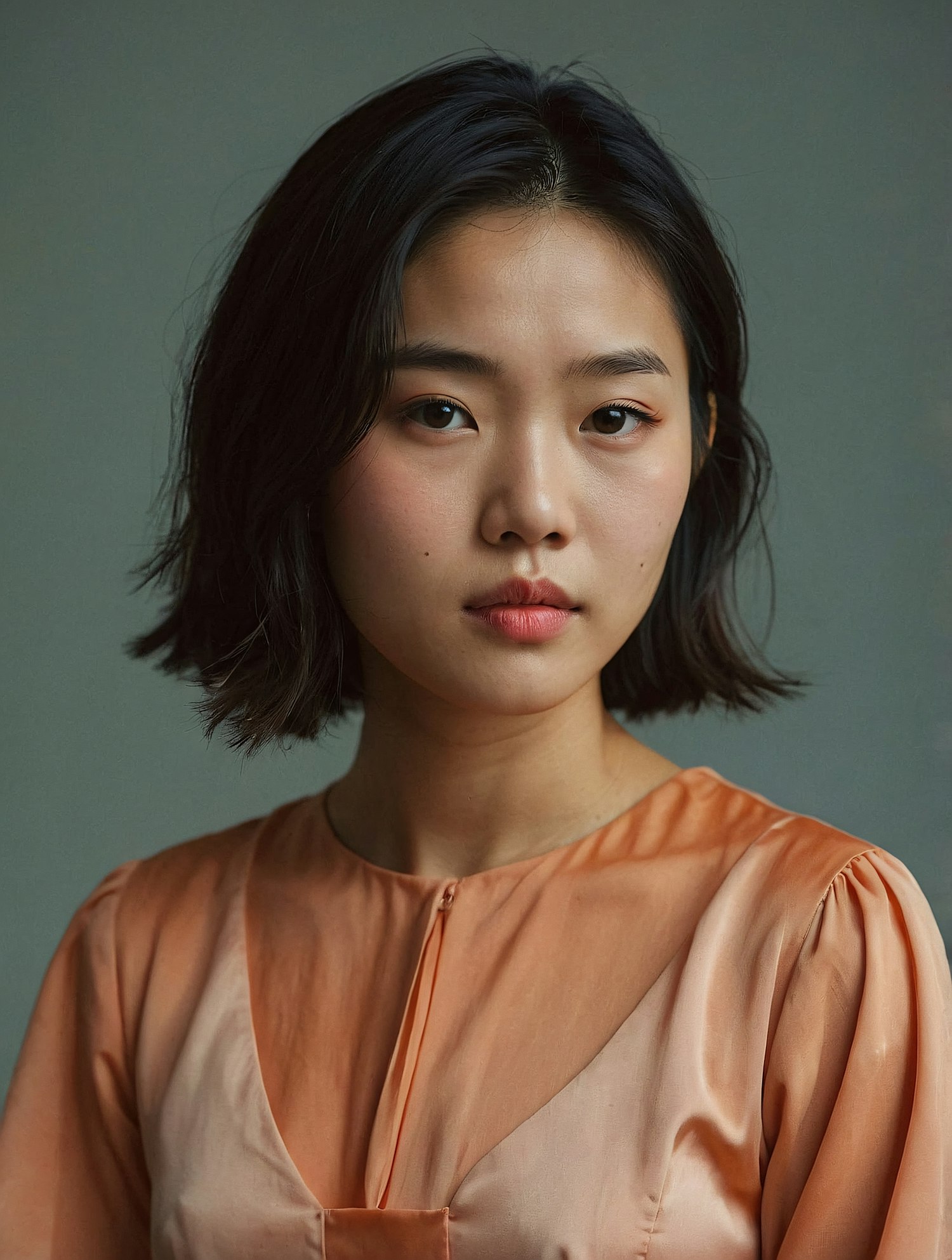 Portrait of an Asian woman with short dark hair in a peach blouse, set against a muted gray background.