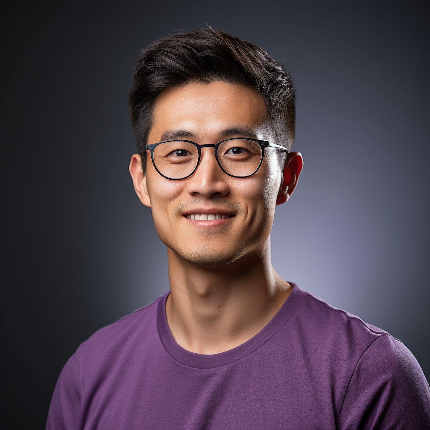 Smiling Asian man with glasses and purple shirt against a dark gray background, exuding warmth and friendliness.