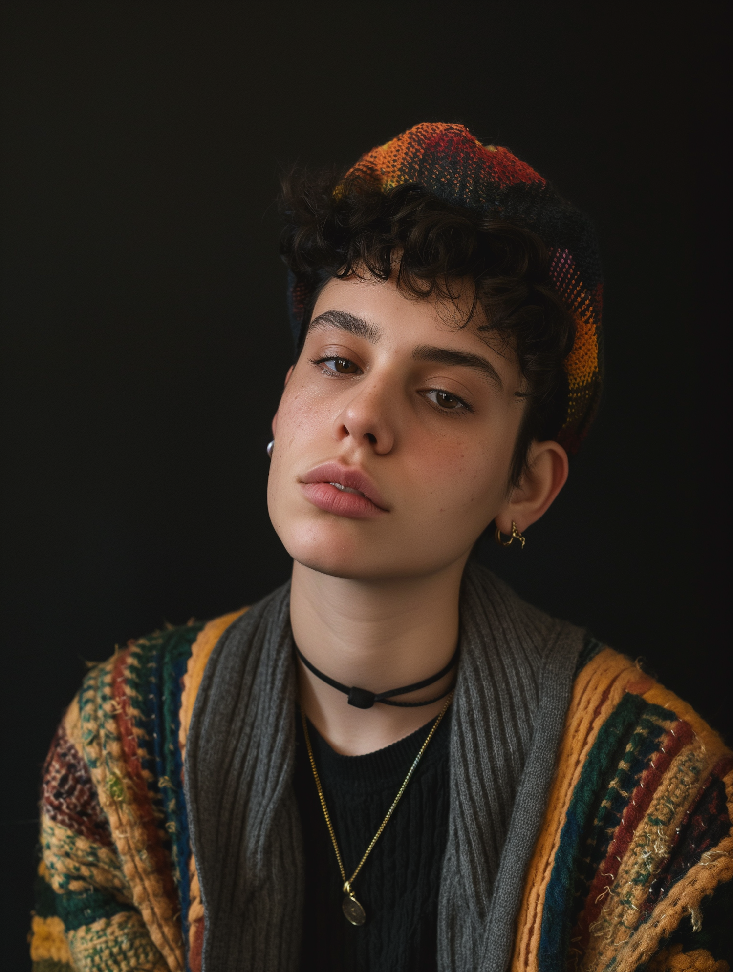 Portrait of a young person with curly hair, wearing a colorful hat and cardigan, accessorized with a choker and necklace.