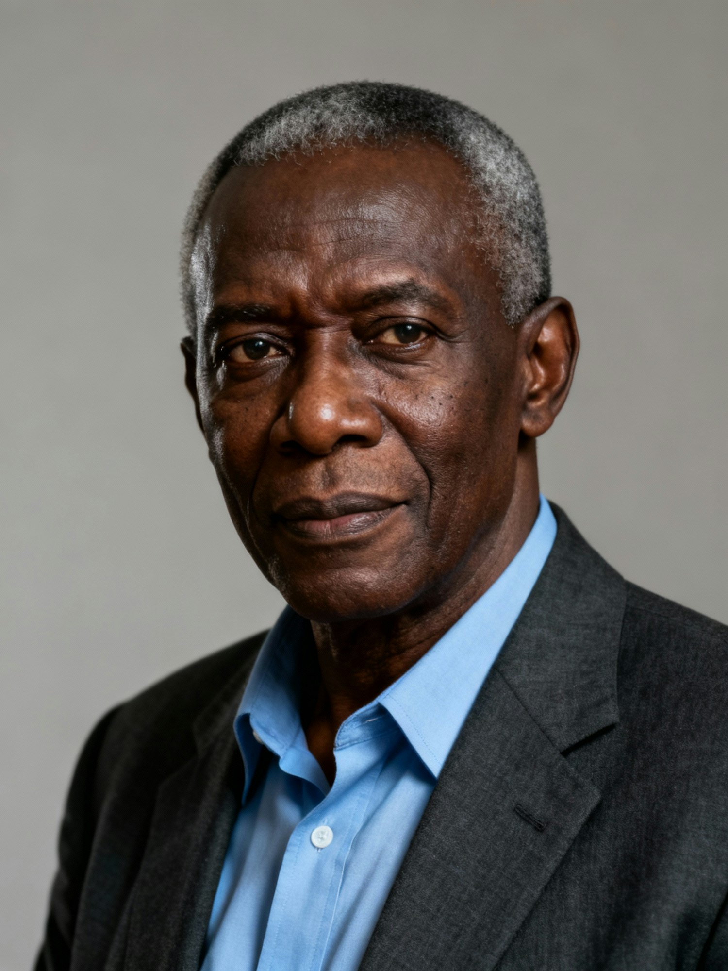 Studio portrait of a Nigerian male history teacher in his mid-fifties; deep brown skin, neutral-cool undertone; close-cut salt-and-pepper hair; charcoal sport coat over a soft blue shirt; neutral seamless backdrop; Rembrandt lighting; 105mm macro-sharp detail; photorealistic, editorial. Expression: reflective authority. Negative: “youthifying” skin blur, exaggerated wrinkle removal.