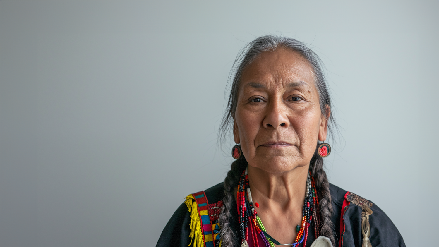 Elderly woman with braided gray hair, wearing traditional attire with colorful beads and patterns, against a plain background.