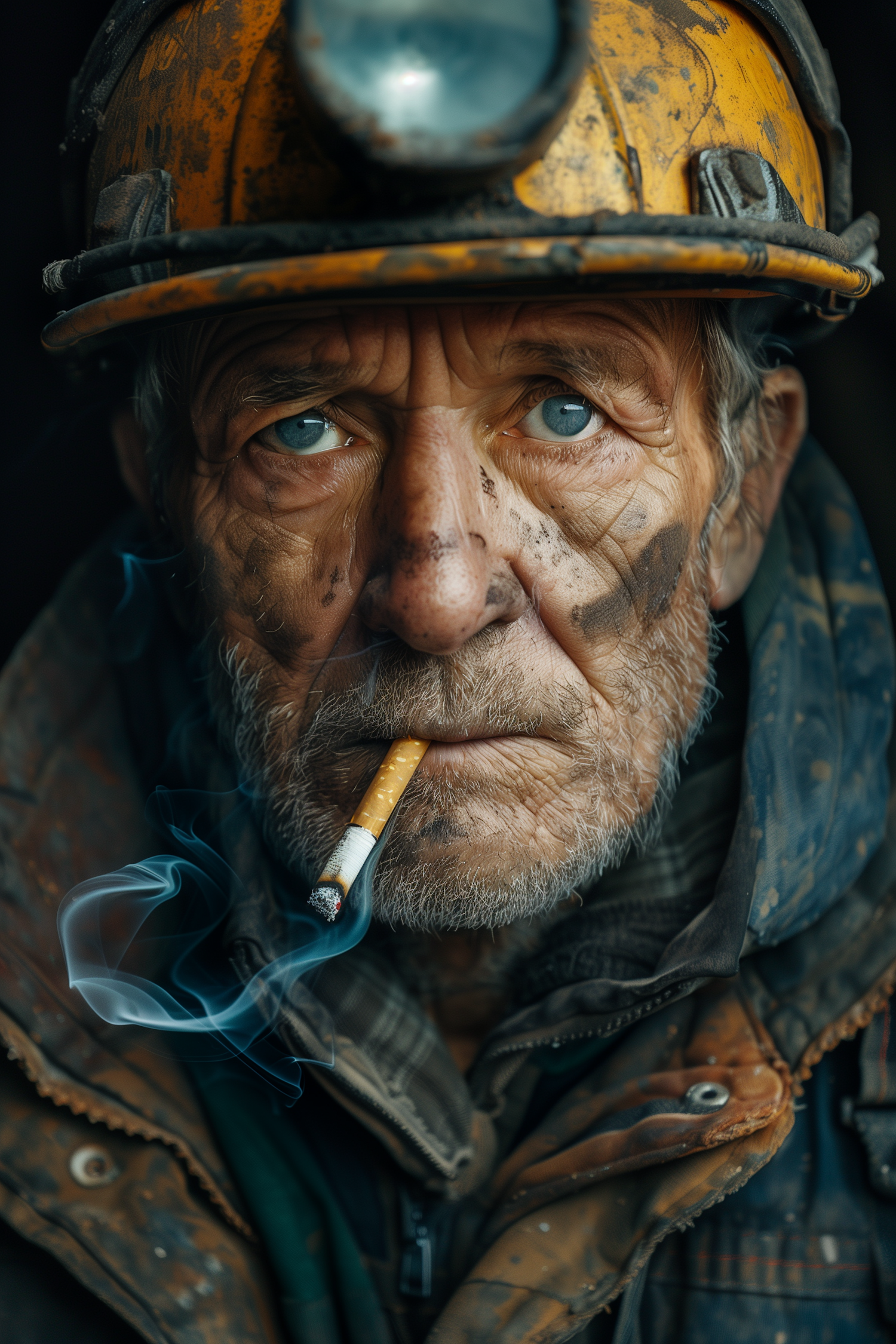 Elderly miner with blue eyes and a rugged face, wearing a yellow hard hat and smoking a cigarette. Dirt-smudged, intense gaze.