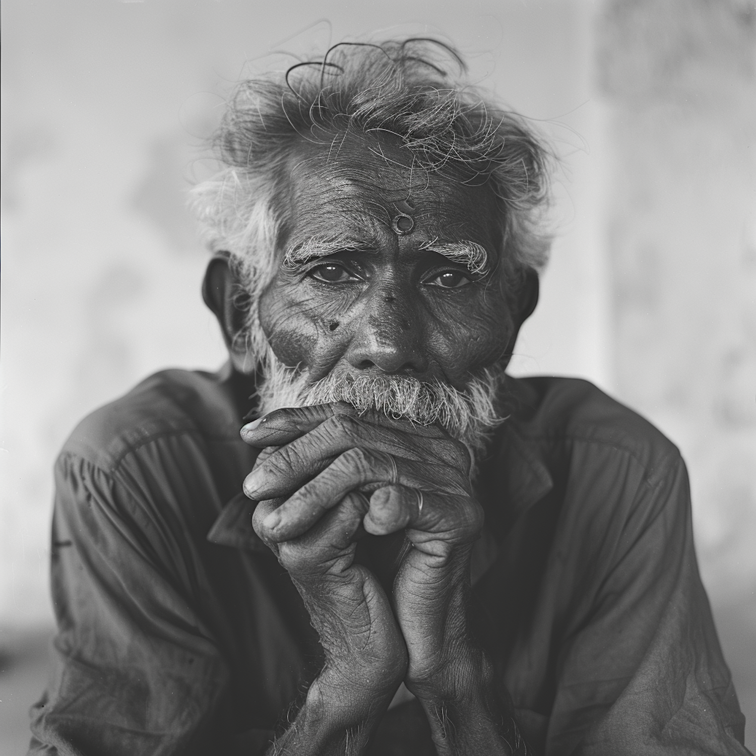 Black and white portrait of an elderly man with a contemplative expression, resting his chin on clasped hands. Intense gaze and textured features.
