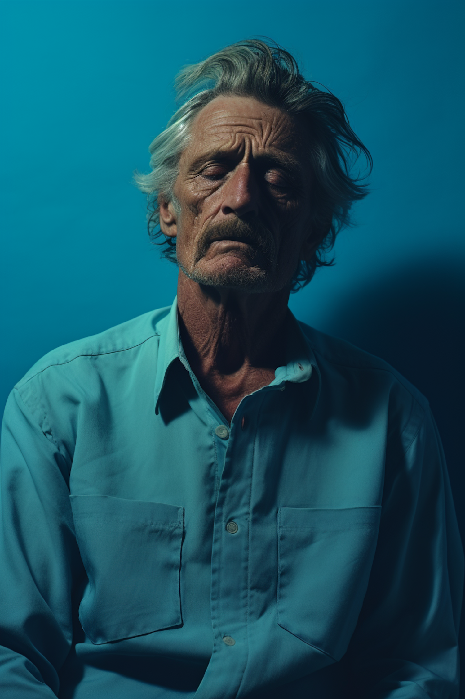 Portrait of an older man with gray hair and a teal shirt, eyes closed in reflection, set against a matching teal background.
