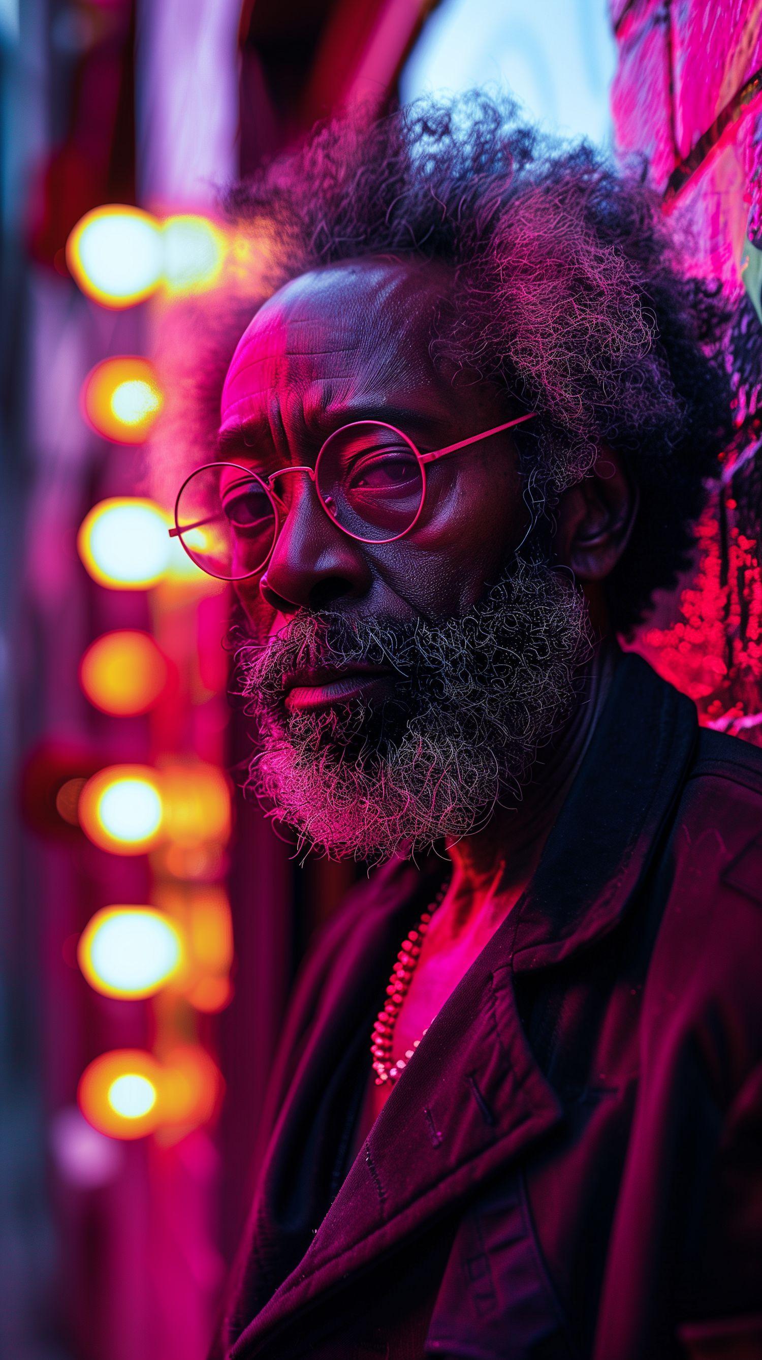 A contemplative man with gray hair and beard in neon lighting, wearing round glasses and a dark coat, against a vibrant urban backdrop.