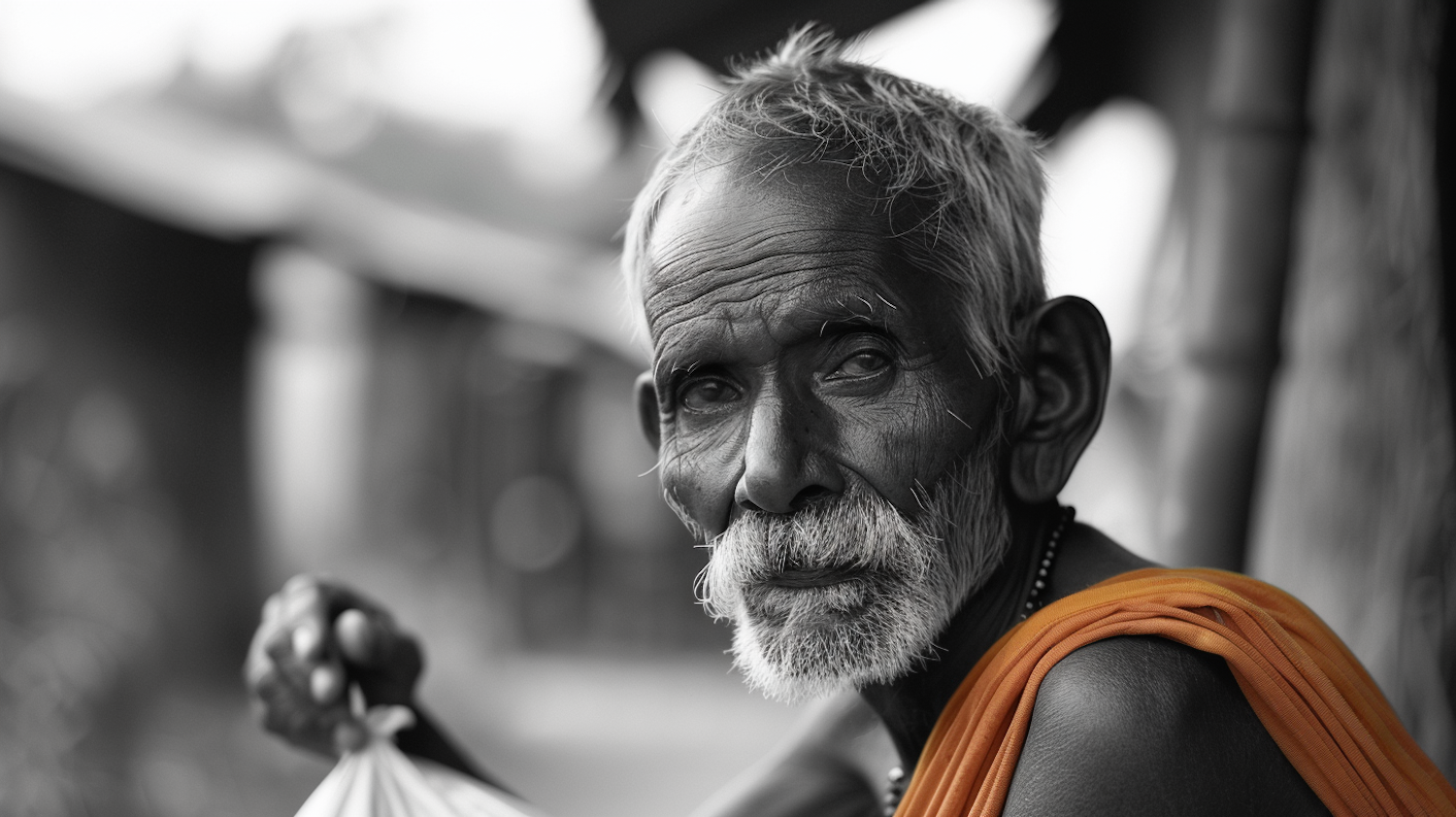 Elderly man with white beard and orange cloth, holding a bag. Thoughtful expression in a monochrome setting with blurred background.