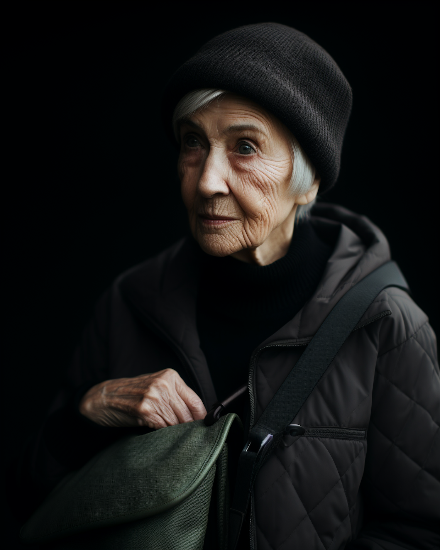 Elderly woman in a beanie and quilted jacket holding a green bag, with a thoughtful expression against a dark background.