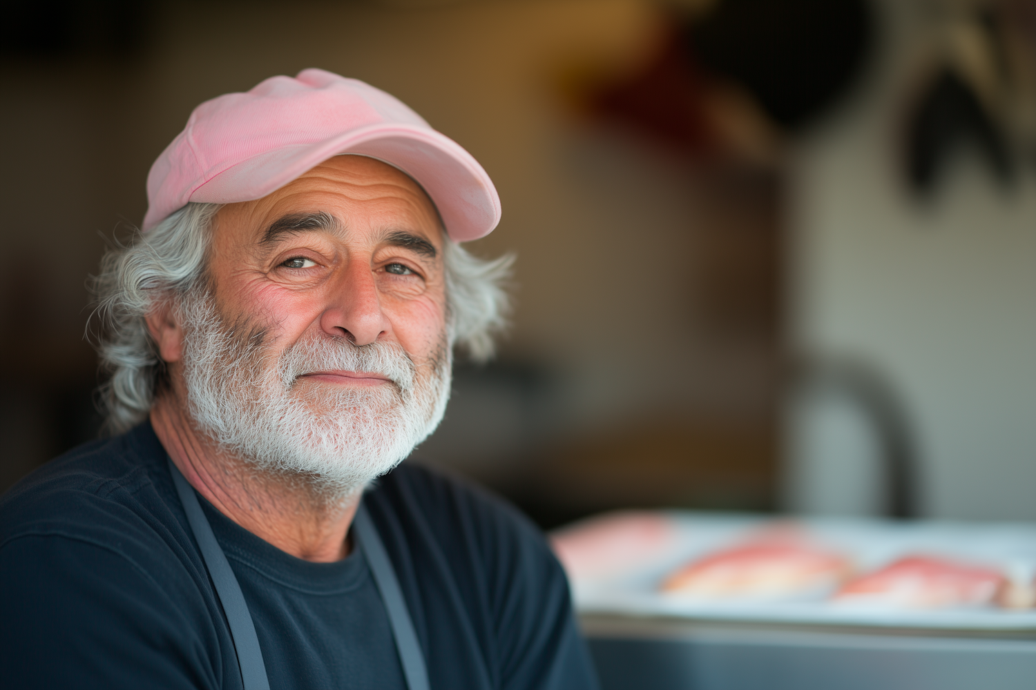 Friendly older man with gray hair and beard, wearing a pink cap and apron, in a culinary setting with blurred background.