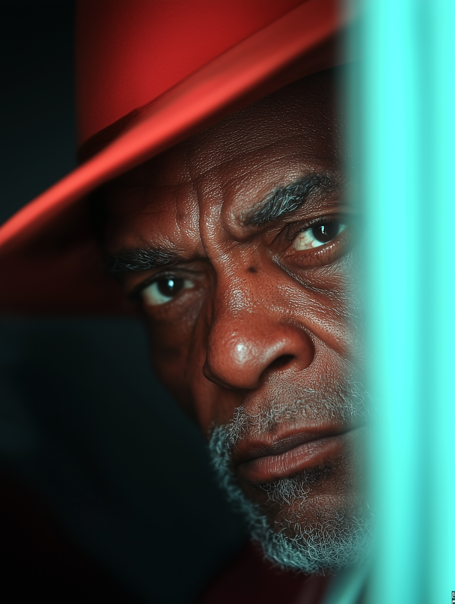 Close-up of an older man in a red hat with intense eyes, gray beard, and teal light creating a dramatic, mysterious atmosphere.
