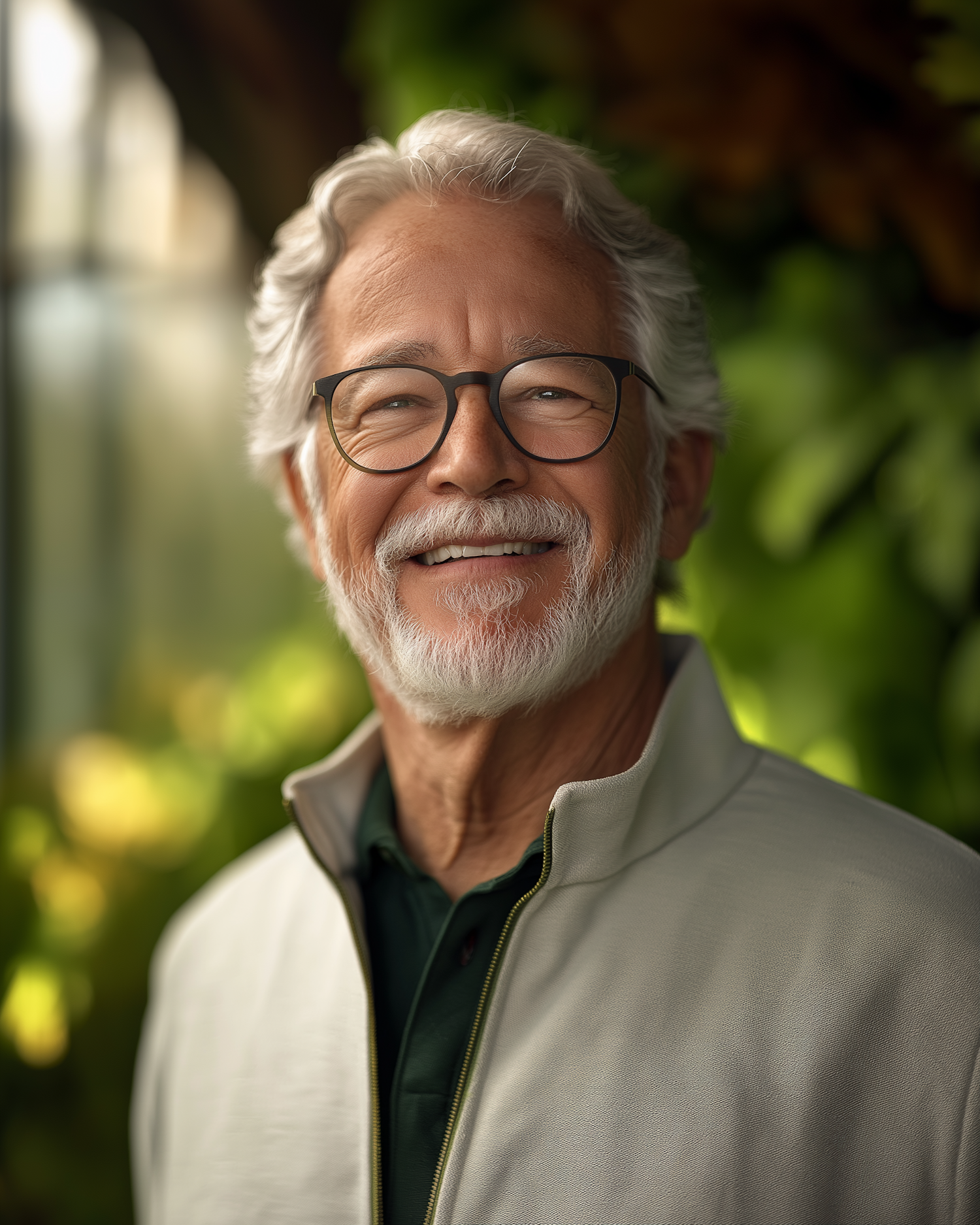 Elderly man with white hair and beard, wearing glasses and a light jacket, smiling warmly against a lush green background.