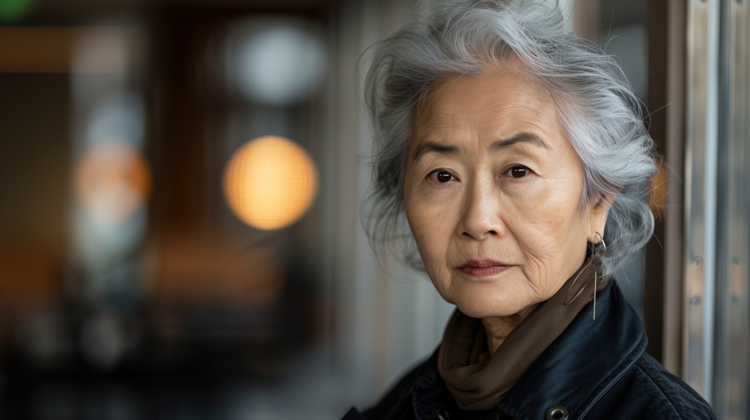 Elderly Asian woman with silver hair in a black leather jacket, standing in a softly lit room with warm, blurred lights in the background.
