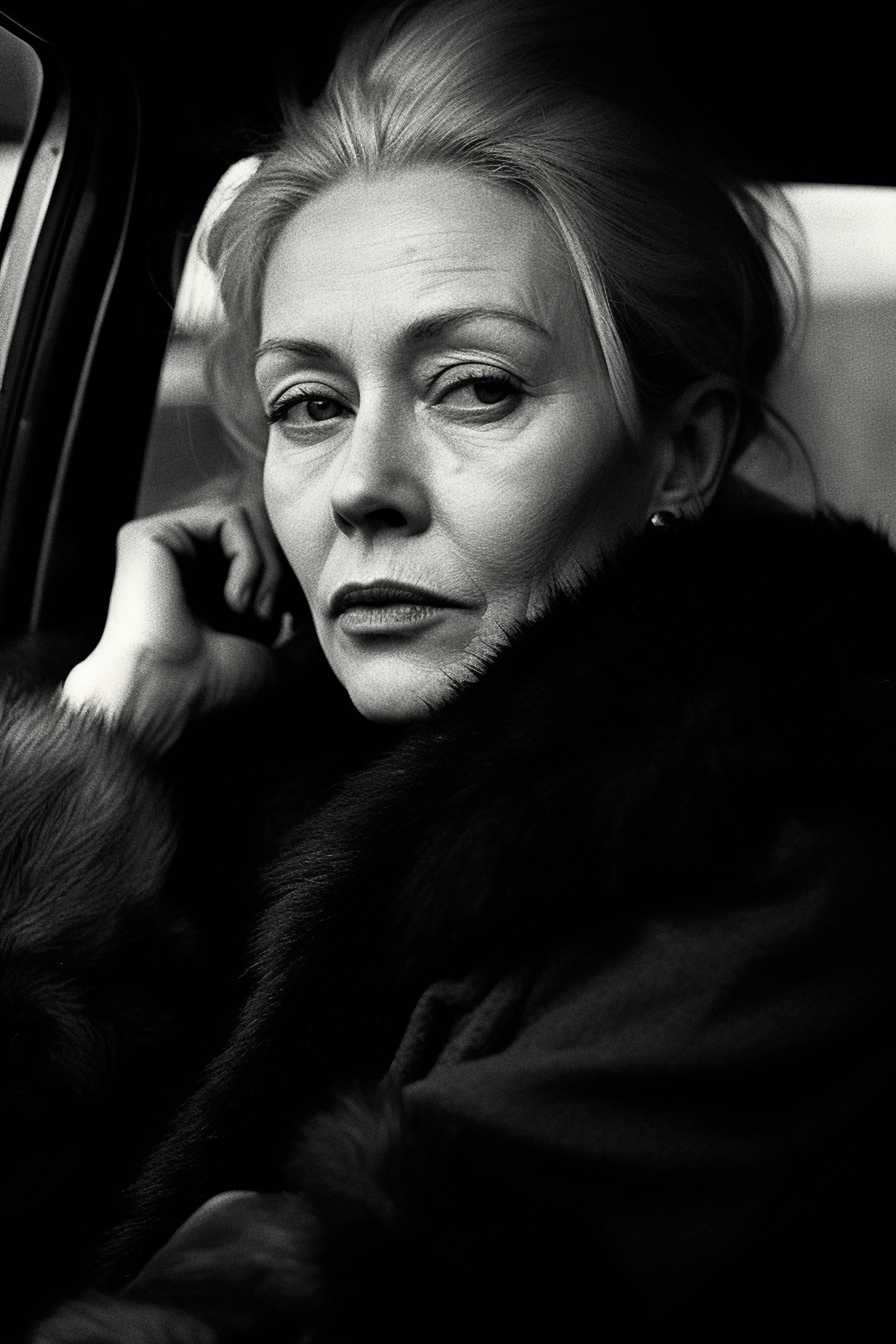 Elegant black and white portrait of a woman in a fur coat, exuding sophistication and depth with a serious expression.